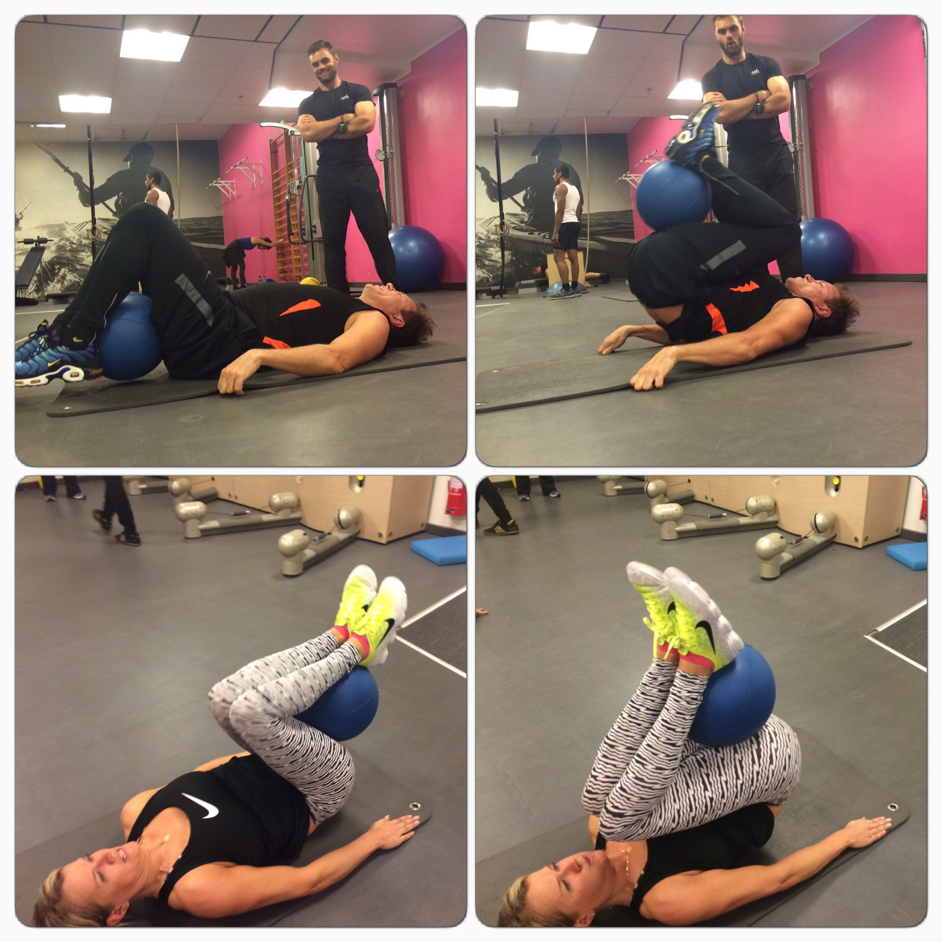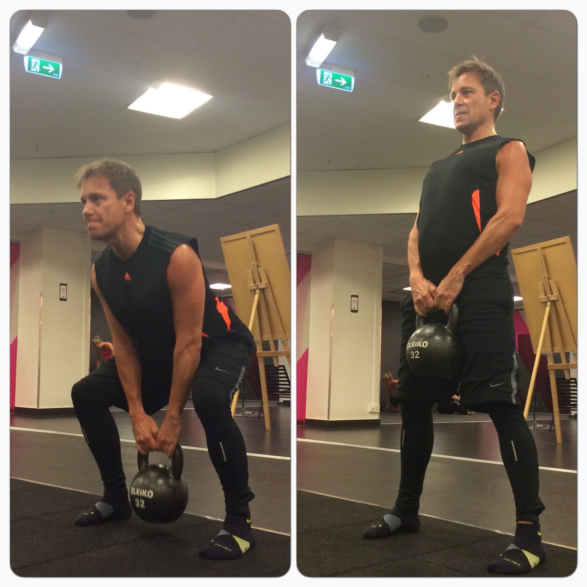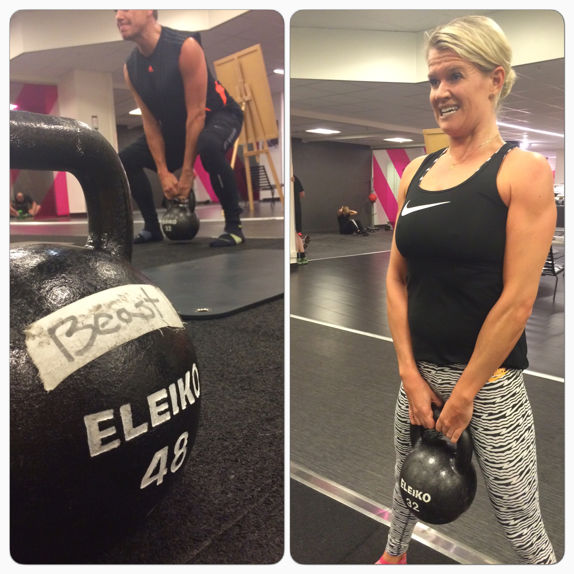 Många bra övningar idag och äntligen är Paul tillbaka. Stor skillnad att träna själv och ha ett proffs bredvid oss. Rumpa, rygg och mage idag. Nytt program och älskade varenda övning. Älskar bara känslan att känna nya muskler jobba. Två av övningarna lite närmre. Kettlebells squate utan skor för aktivera sätet mer, placerar kettlebellen längre bak i slutläget, vid hälarna i stort sett. Den, den kändes i rumpan! 5 set! Uppvärmning lägre vikter för stega uppåt och Christer – han fick gå och hämta ”The Beast”! Nu snackar vi! Paul is back!