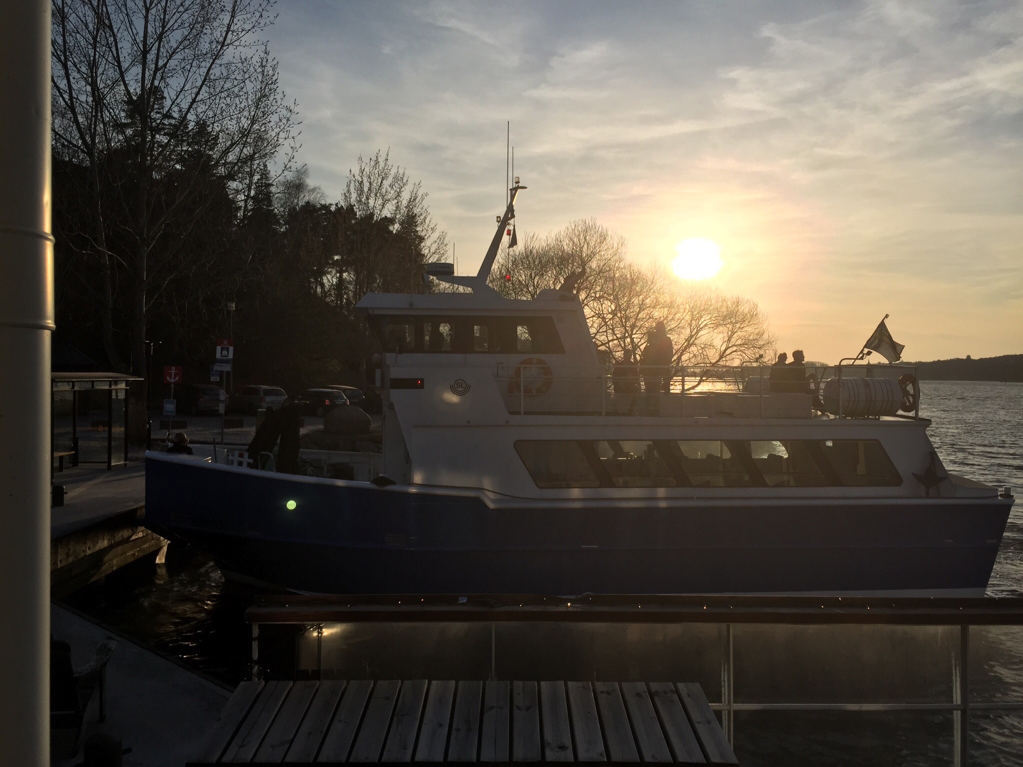 Panik! Eller? Kom på mig själv. Vi lämnade bilarna hemma efter jobbet igår jag och Christer för ta bussen ner till Restaurang J för skön afterwork vid vattnet i det vackra vädret. Väl framme vid bussen kommer jag på att mobilen blev kvar hemma. Men näää! Ååå!!! Var ju nästan på väg att vända, det funkar ju inte! Måste ju ha mobilen! Eller? Stannade upp- men på riktigt, är det så farligt, behöver jag verkligen den? Nä! Det behöver jag ju inte! Det är fredag. Och jag är här med Christer. Jag behöver inte bli nådd. Låt den ligga. Kände nästan lättnad. Vad skönt. Ingen mobil! Det blev en skön kväll i solnedgång och sen middag med båtarna som passerade utanför. Stockholm är vackert! Christer fick ta någon bild. Jag kunde ju inte.