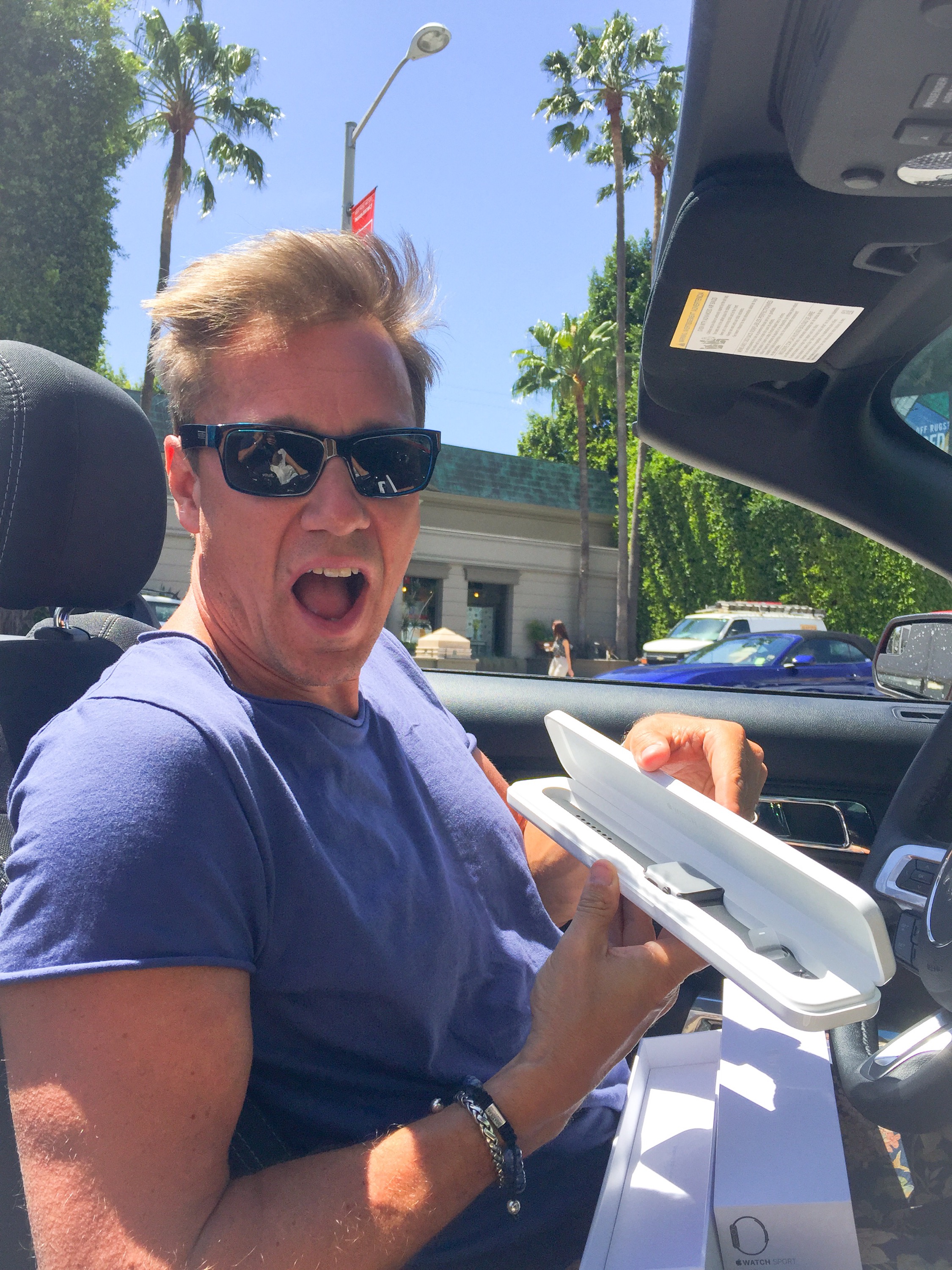 Det blev en tillslut. En Apple Watch till Christer. Enda butik i hela världen, just nu som fick lanseringen, inte ens Apple Stores. Det blev och är Maxfield. En liten cool butik som säljer dyra märkeskläder annars belägen på 8825 Melrose Ave West Hollywood. Bara runt hörnet där vi bodde förra veckan. Vilken timing! Ingen visste när det skulle lanseras, som vanligt går rykten. Sen kom det, på nyheterna som jag satt och kolla på på fredag morgon, Christer hade redan hunnit till sitt seminarie. Jag messade honom snabbt. Han svara Gå dit!! Jag vill ha silverklockan i stainless steal. Jo visst. Jag knallade dit innan mina möten, naiv? Optimistisk. Bara det att kön var runt hela kvarteret, där folk sovit i kön sen 22 kvällen innan. Galet! Och just brevid mig, killen längst bak, sist i kön köpte en placering längst fram för 600 dollar!! Av en smart kille som köat för att sälja! Vilket han ju gjorde. Smart! Eller bara dumt, jag vet inte. 🙂 Så killen köpte sig fram. Men dom kunde inte säga hur många klockor dom fått men det kom in hela tiden. Det var ju bara att glömma för mig. Alla nyhetskanaler var här, sände fortfarande. Är det inte sjukt! För en Apple Watch!