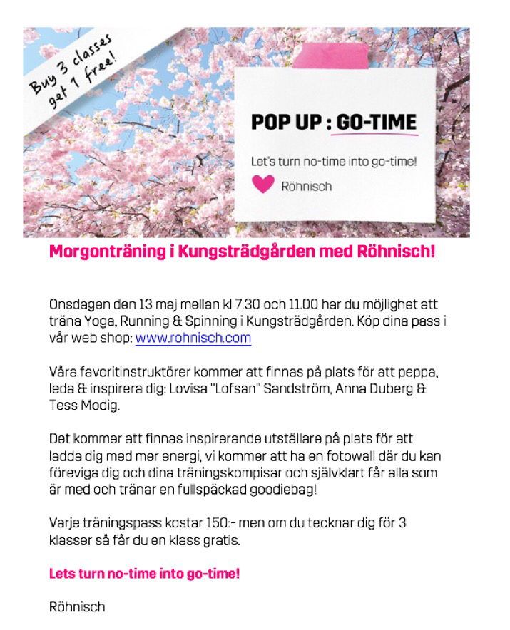 Har du bokat dig?! Det finns platser kvar! Nästa vecka 13 maj kan du träna med mig, Louise ”Lofsan” Sandström känd från Nyhetsmorgon och Anna Duberg. Skön träning utomhus, bra start på dagen sen får du urfin, fullpackad goodiebag med! Vet du, det finns fåtal platser kvar så tveka inte, ”gör det inte imorgon” boka dig idag, nu! Så ses vi nästa vecka! Du kommer inte ångra dig. För när kan man träna i Kungsträdgården liksom under dom vackra nu blommande träden?:)