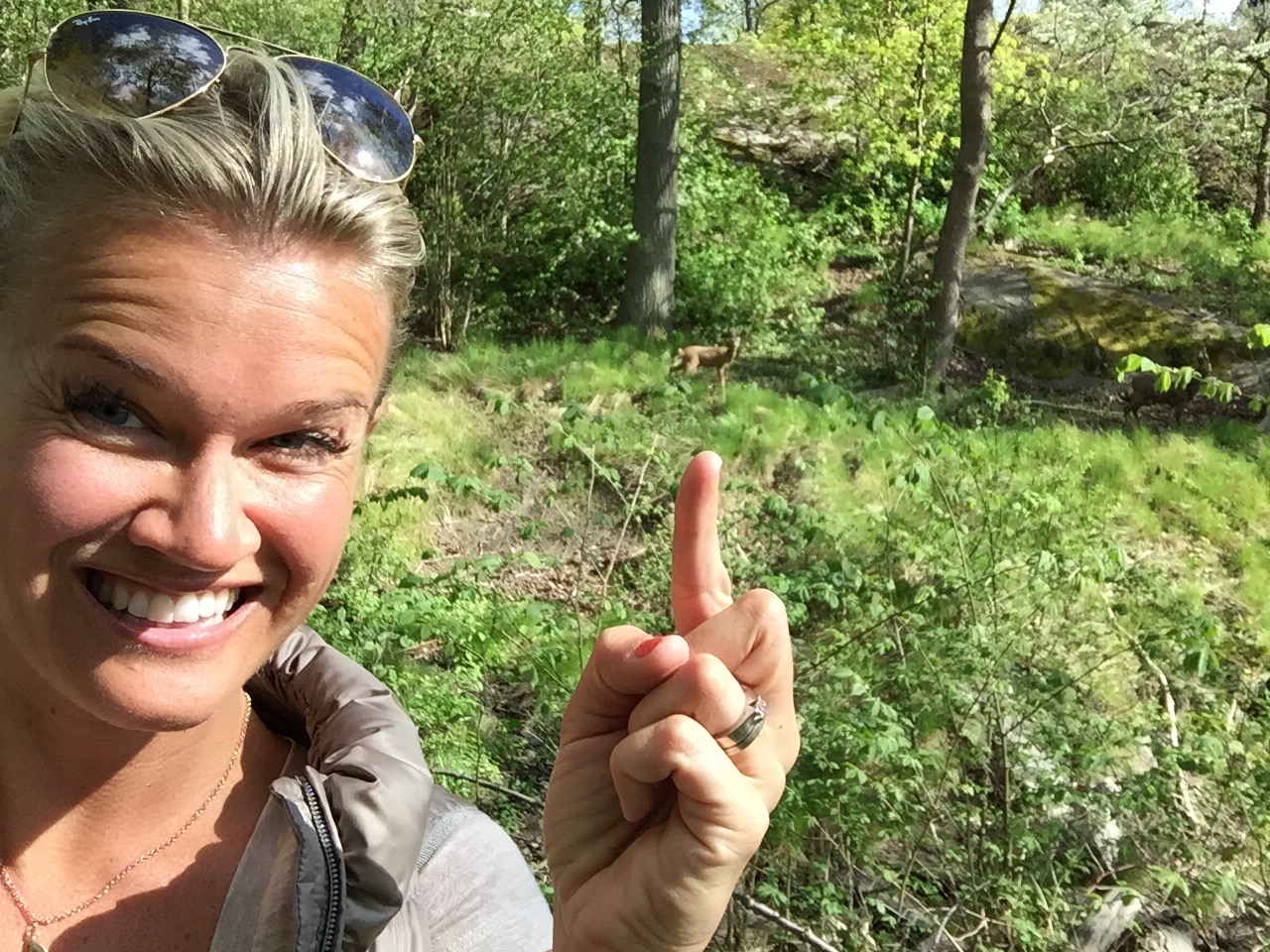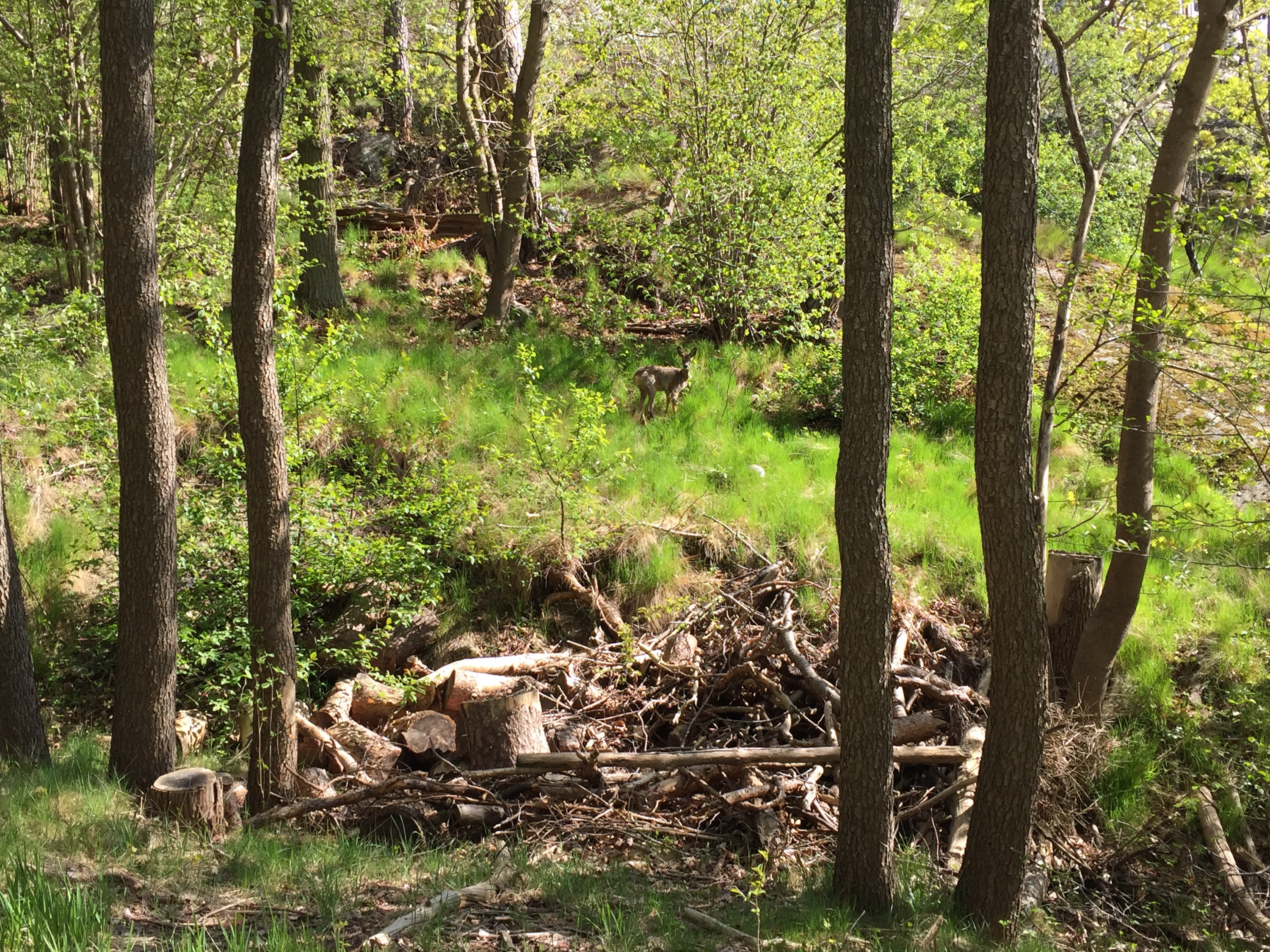 Kom ni ihåg hjortarna i L.A! Vid löprundan. Då jag sa vi har dom hemma hos oss också! På vägen ner till båten så stod dom här tre stycken! Hela familjen med en ganska ung liten hjort, andra bilden. Rassla till i buskarna och var alldeles nära mig sen stanna dom blickstilla när jag gick förbi. Christer redan nere vid båten, jag med picknickkorgen innan det bara iväg. Tänk i Stockholm!?? Ibland är dom vid vårt hus med och kikar in. You never know. Oh dear! 🙂