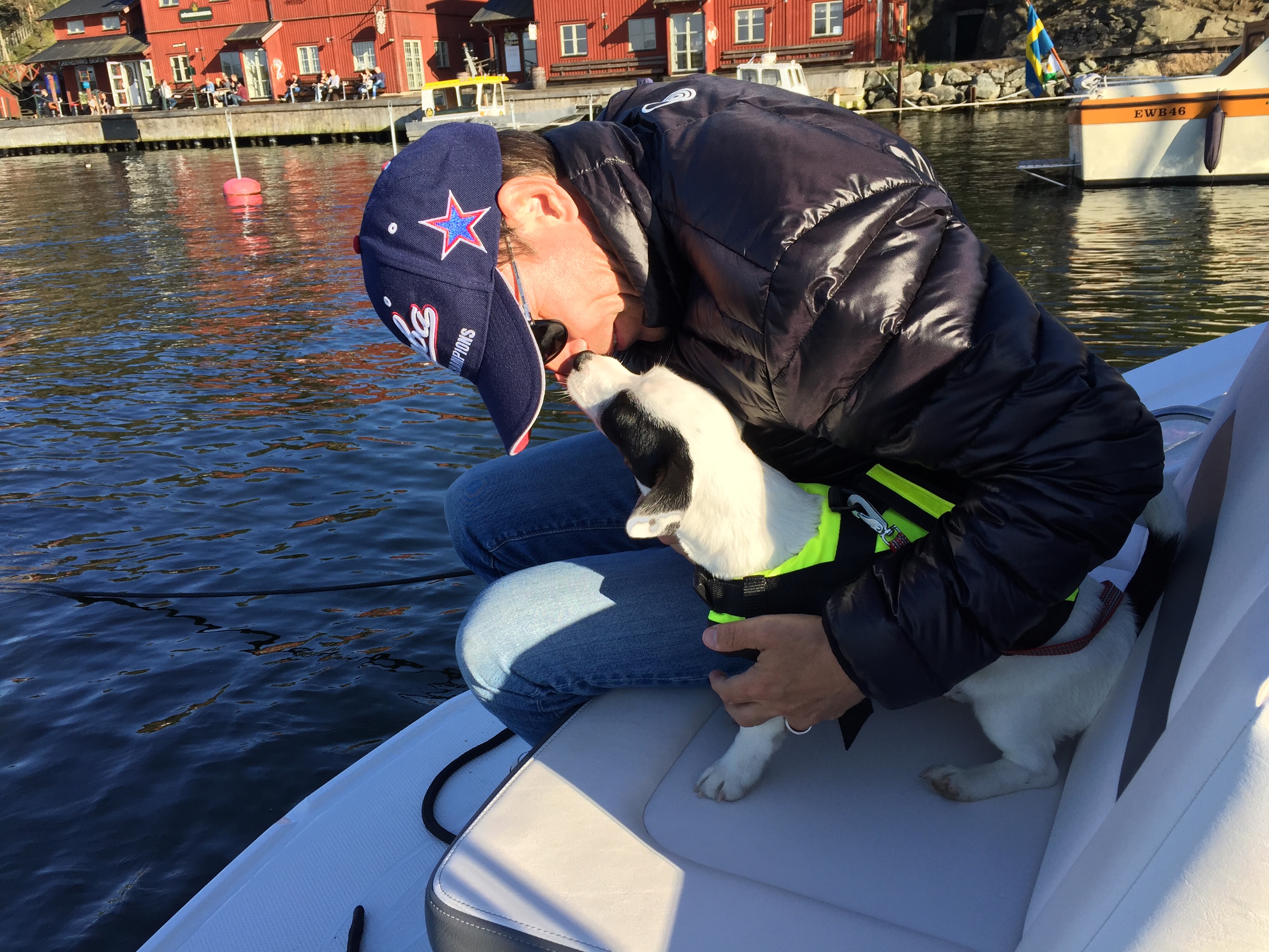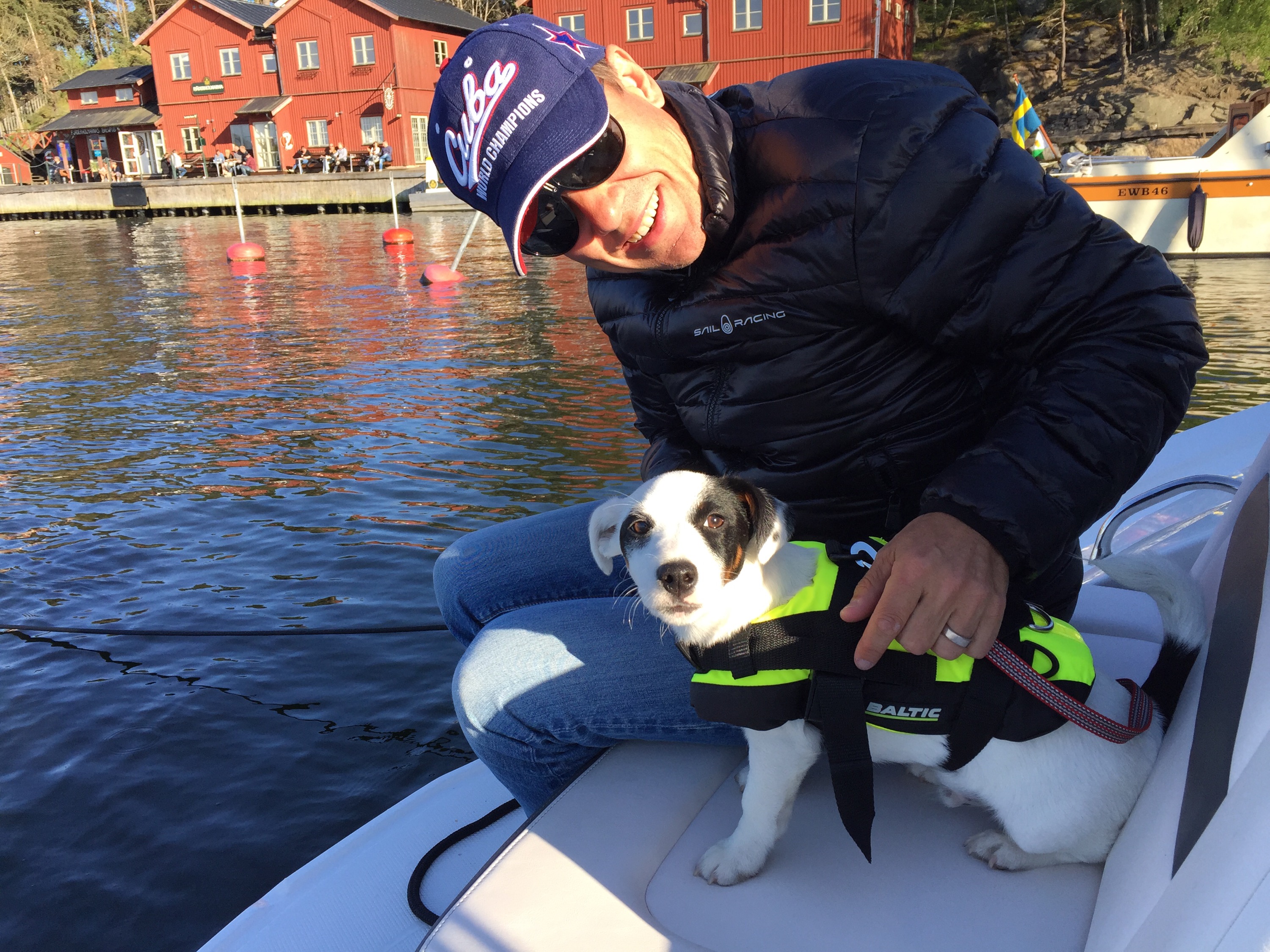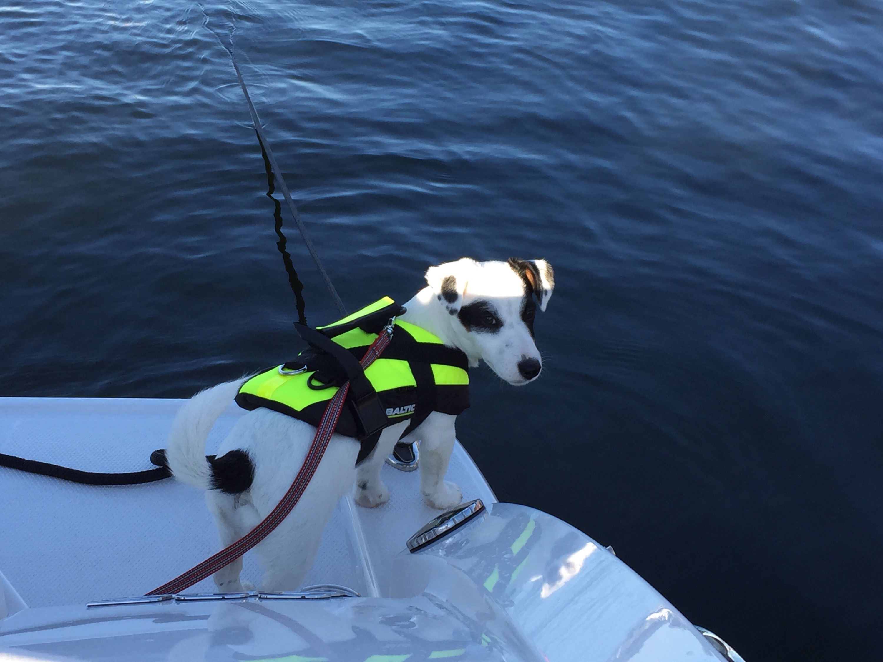 Vi åkte under lördagen och hämtade våra vänner J&J, Jessica och Johan och deras fina lilla Jack Russel Ludwig! Perfekt! Vi måste ju se hur båten är med hund! Kung Ludwig världens coolaste, hade fått en egen flytväst och trots bara halvåret så verkade det som han inte gjort något annat än åkt båt! Han älskade det! Lite sammanbiten först men sen var det för mycket att titta på med fåglar, vattnet som guppade och alla dofter. Han somnade gott medans vi åt middag då vi la till vid Fjäderholmarna och åt på båten med mat jag fixat hemma. Vilken underbar lördag!