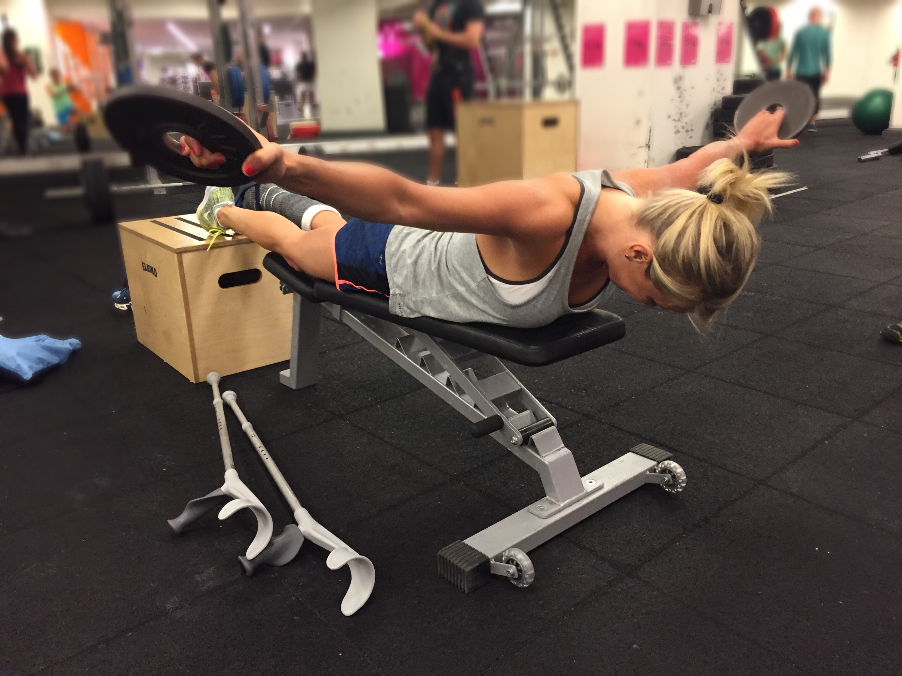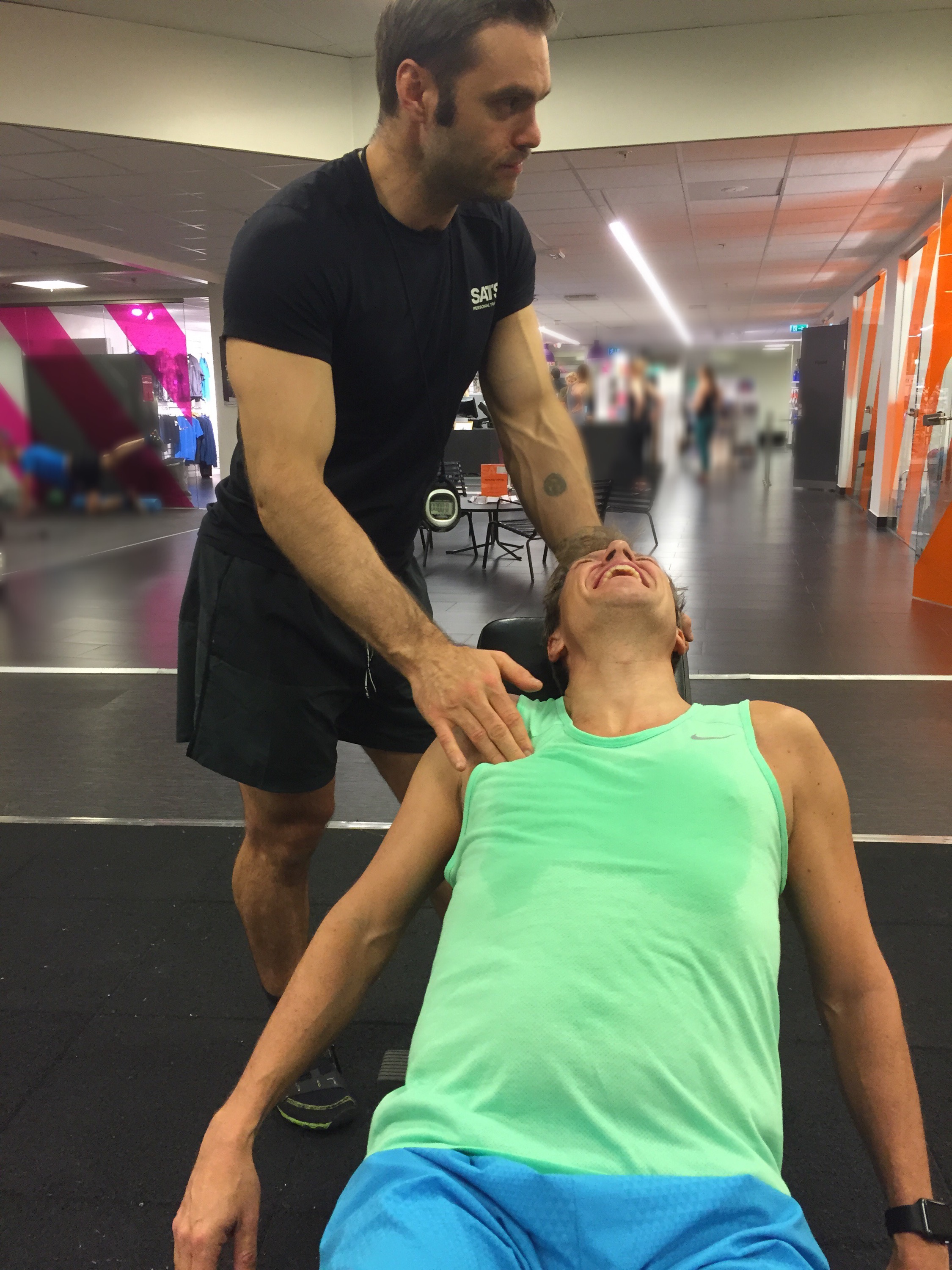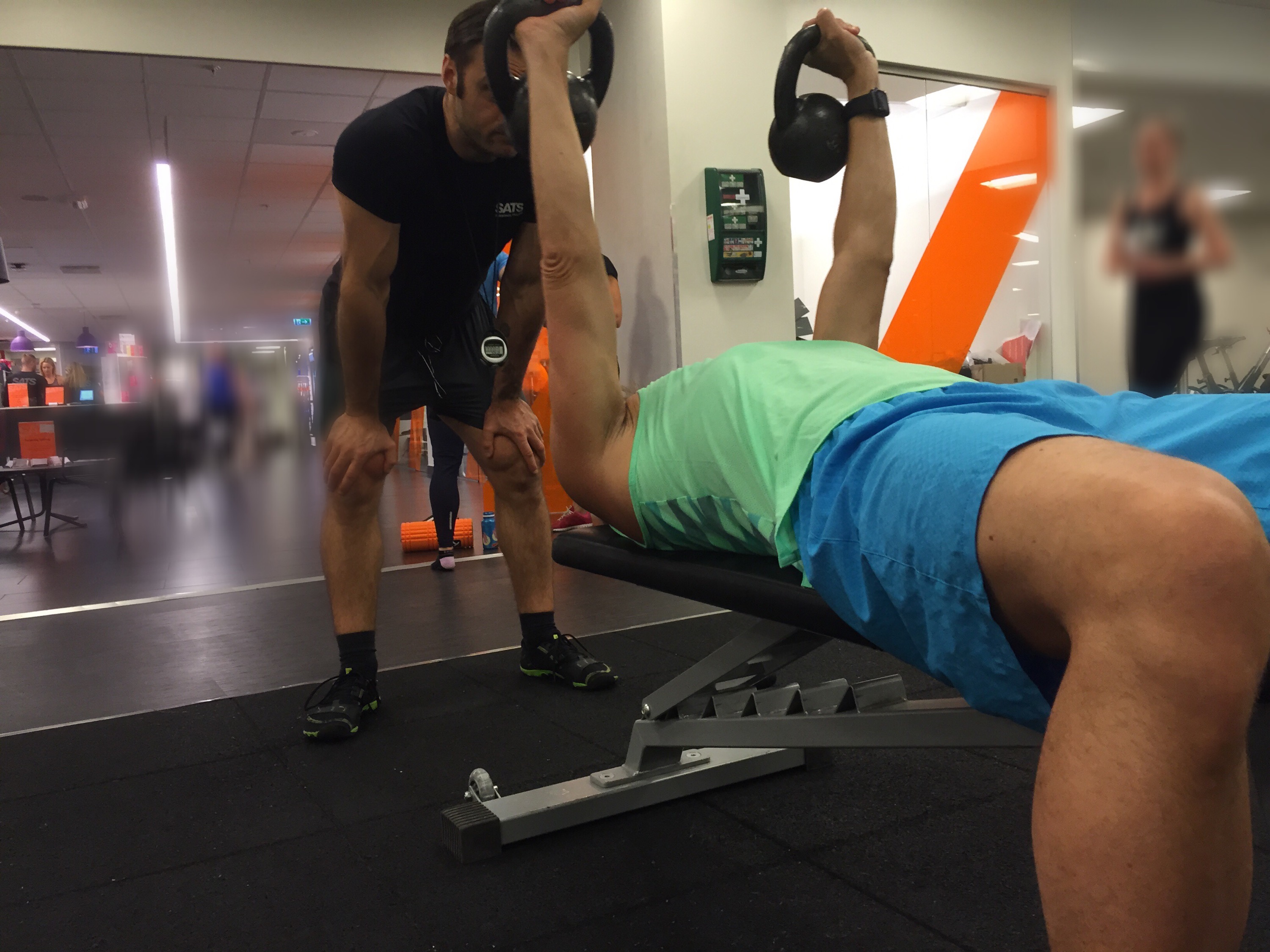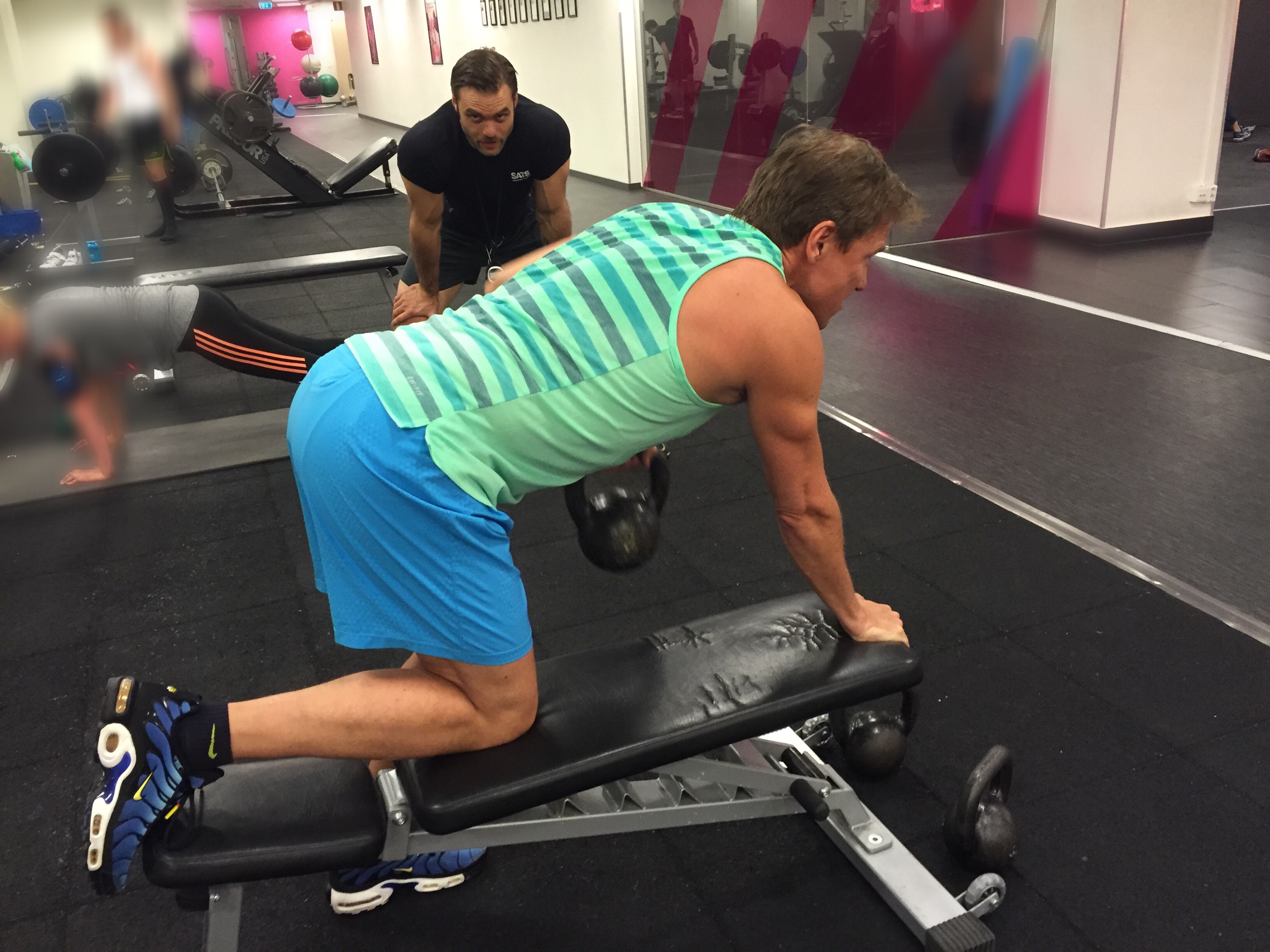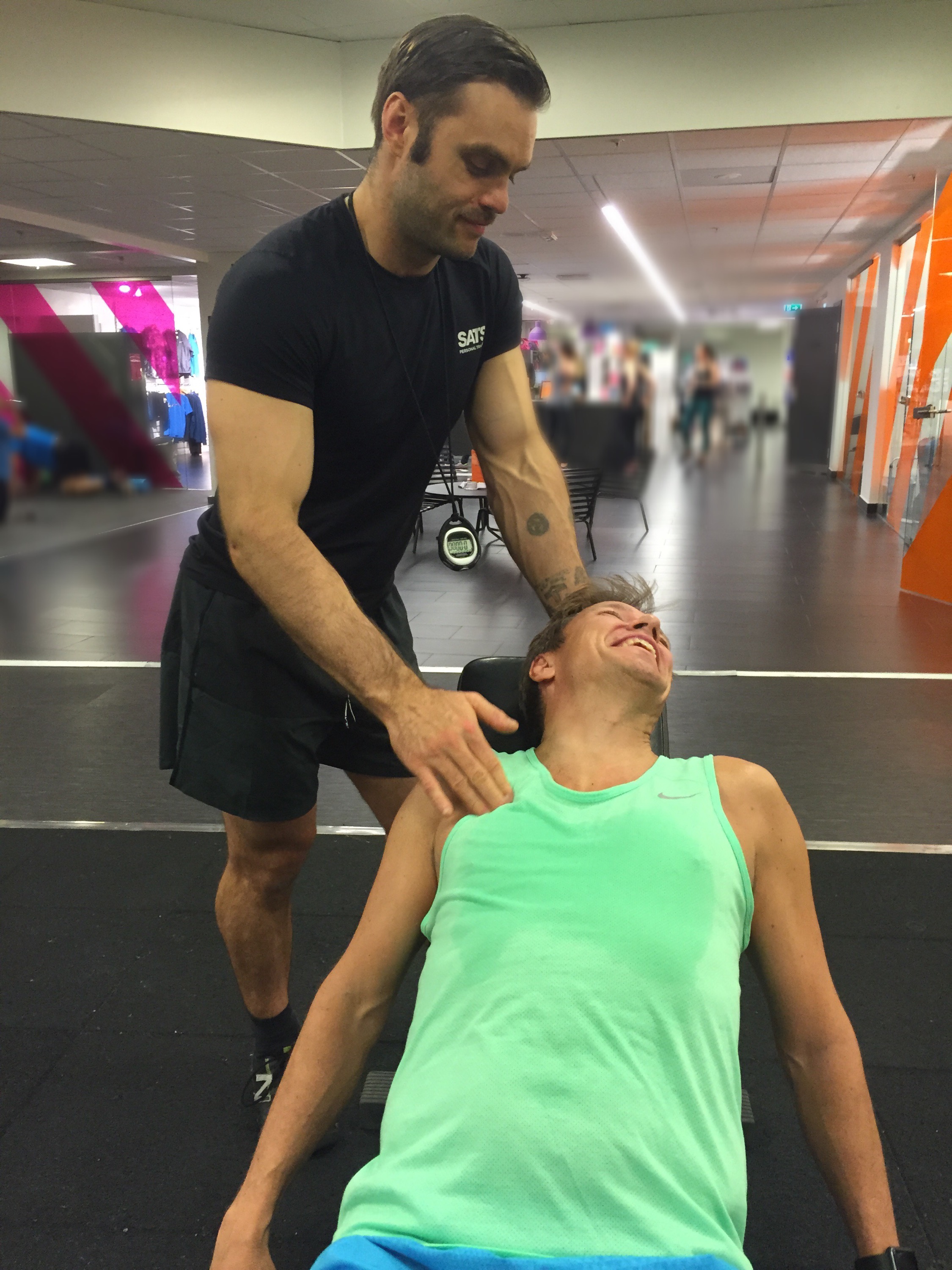 Paul hade förberett ett program som var anpassat för mig nu, fokus överkropp och min positiva man var självklart med och körde på precis som vanligt! Va glad jag kände mig. Bara måndags sen jag var här sist men kändes evigheter sen. Kändes underbart, att jag kunde ta mig hit, och att det funkade riktigt bra med övningarna. Jag ska bli sjukt fit i överkroppen efter dom här veckorna. Sen får jag ta ben och rumpa i sommar för dom lär ju försvinna, små som dom redan är, efter det här. Kan ju träna höger i och för sig! 😉