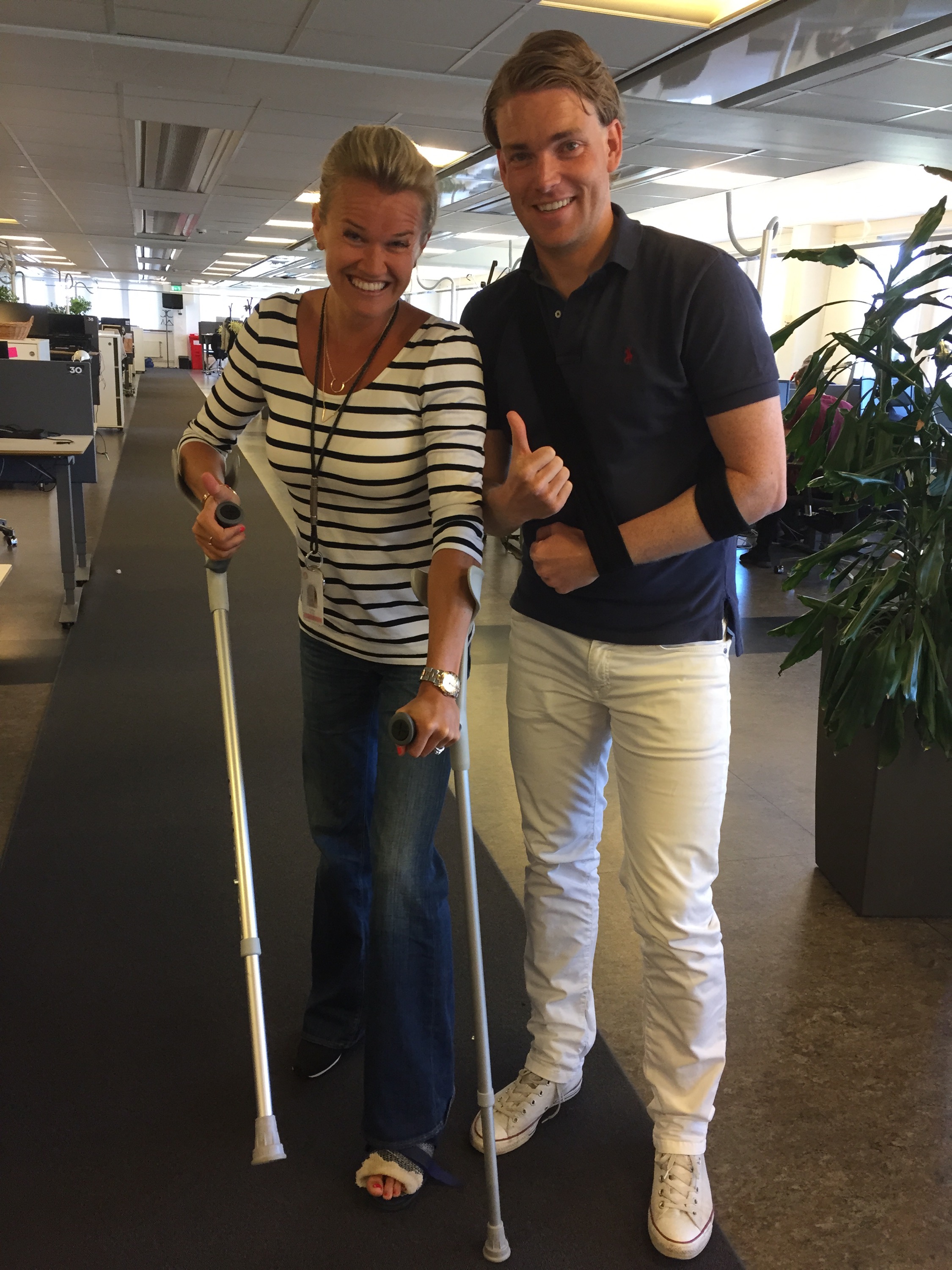 Inget kan stoppa oss! Marknaden är tuff! Be careful out there! Måste sett rätt kul ut när jag luncha med mina kollegor på TV4 idag och jag kommer hoppandes med kryckor och gipsad fot in i personalrestaurangen, Alexander efter med ett brutet nyckelben!! Ja, så här jobbar vi på TV4!:)