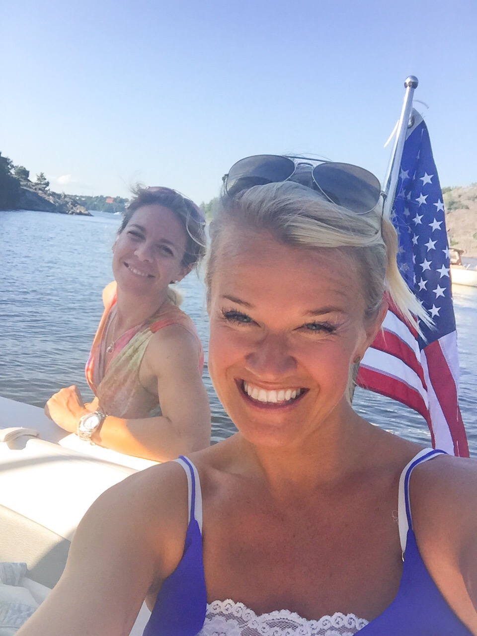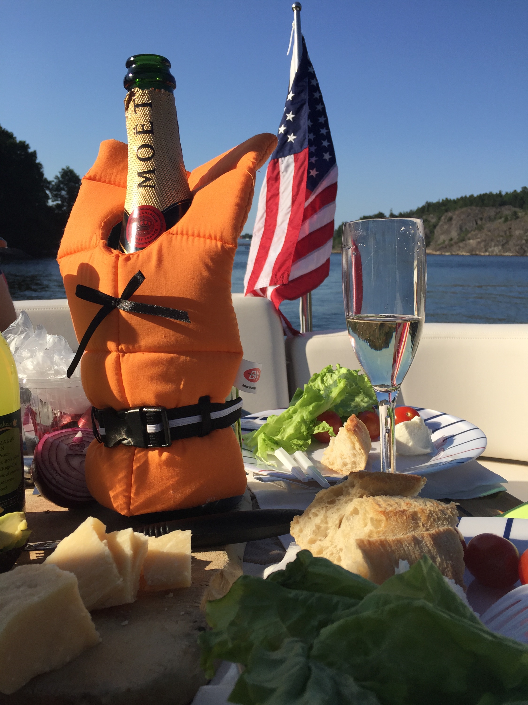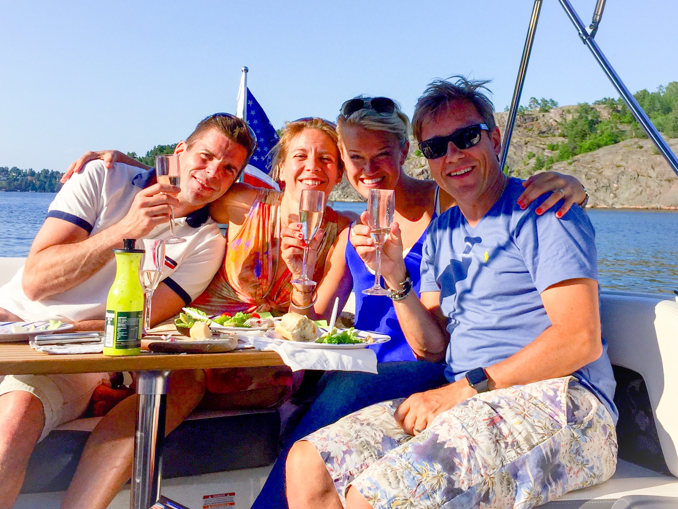 Efter välgjorda naglar, lyxigt, mötte fruarna upp männen, Christer, Johan, och Ludwig så klart. Ni kommer ihåg världens coolaste Jack Russel! Vi skulle på kvällen till Gröna Lund för gästa Sommarkrysset så vi tog båten från oss. Med en fullpackad picknickkorg drog vi ut på sjön och ankrade vid Nyckelviken, tog fram champagnen, vi måste ju fira 4th of July och dukade upp för middag då Jess och Johan hade tagit med sig kyckling, sallad, ost, baguetter som vi fixa ihop till god sallad på båten. Och till Ludwigs stora förtjusning för här låg alla svanar och en andfamilj kom också på besök. Spännande ju!:)