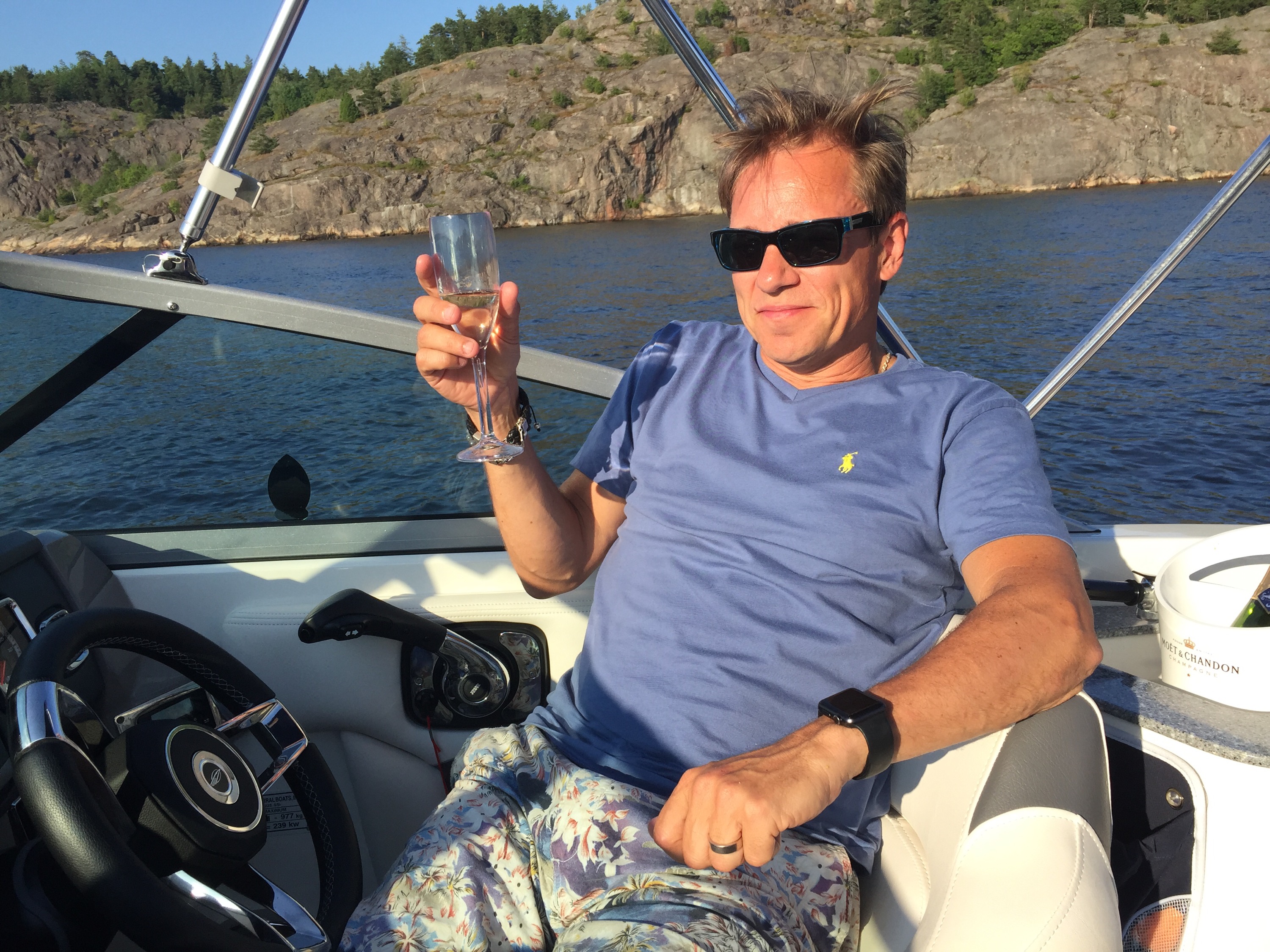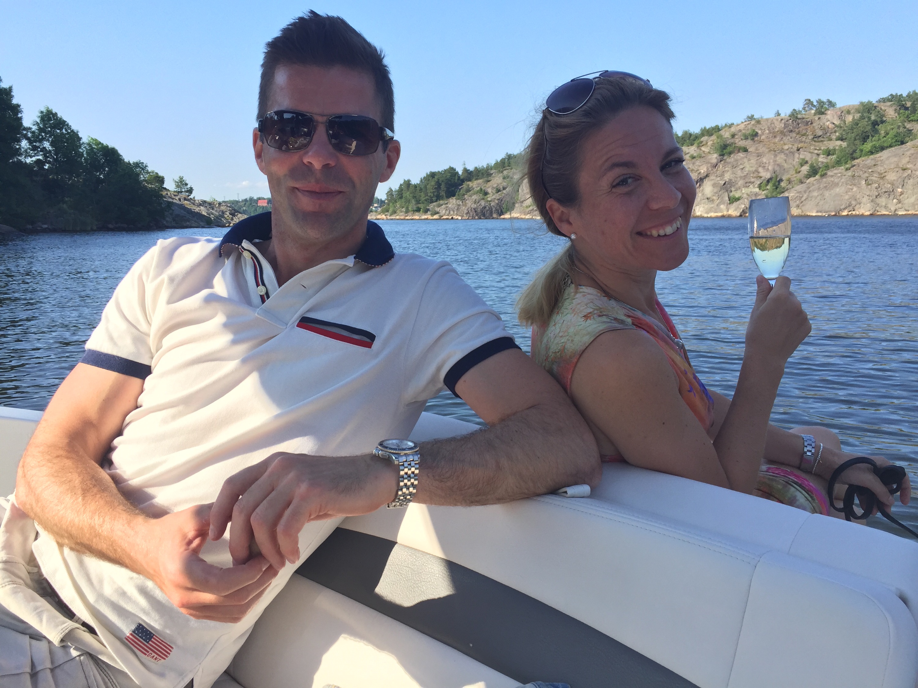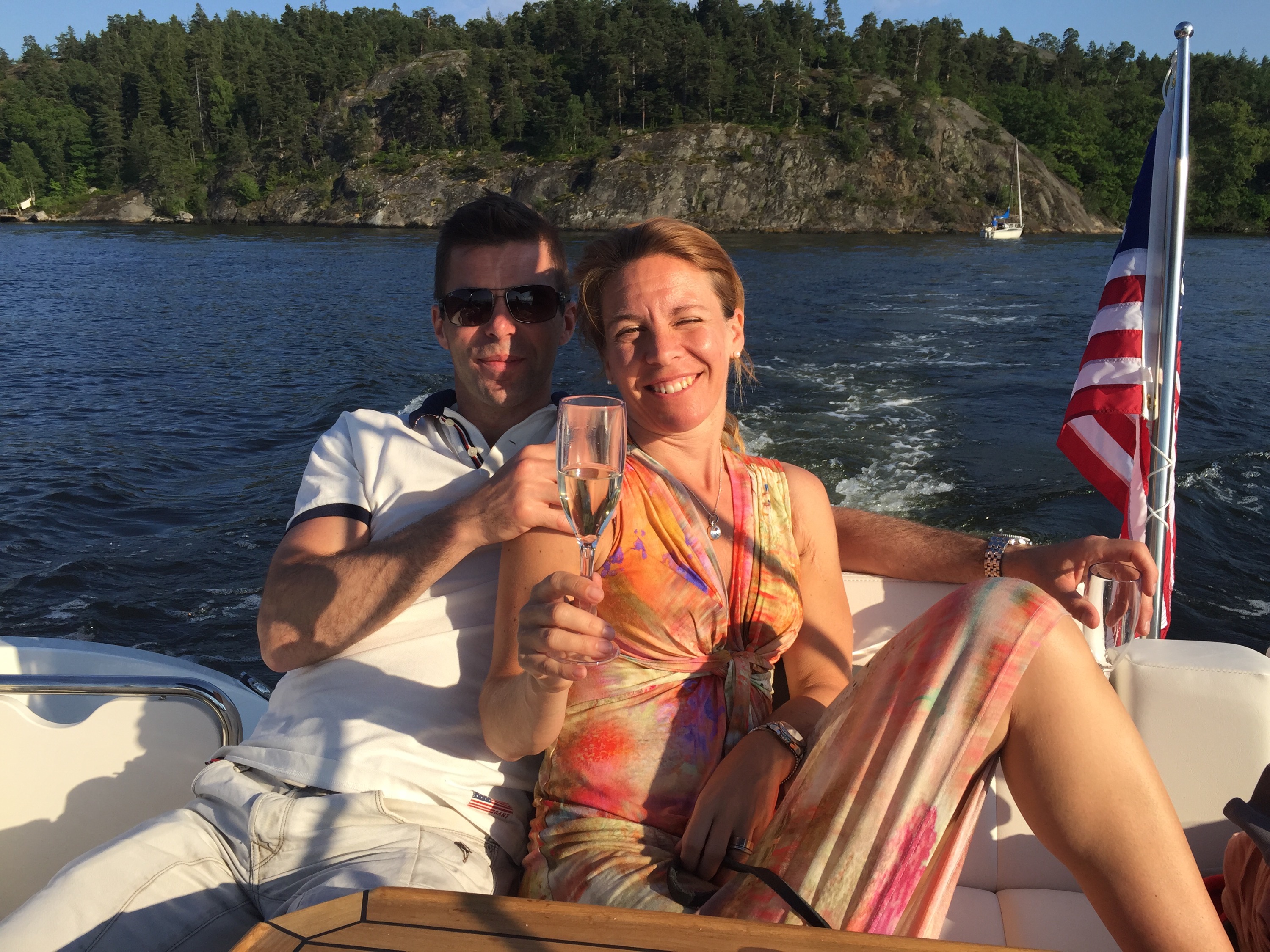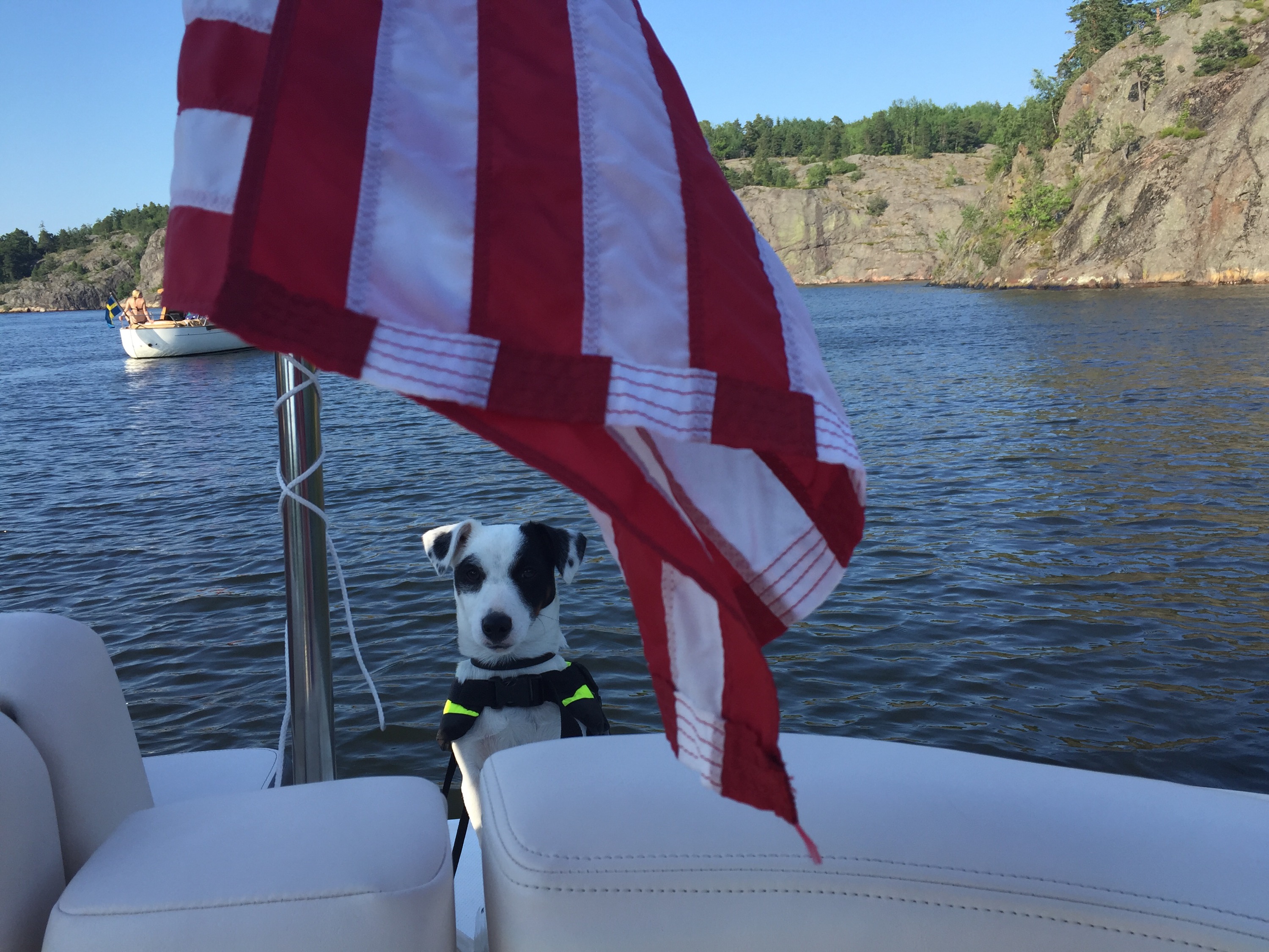 Efter välgjorda naglar, lyxigt, mötte fruarna upp männen, Christer, Johan, och Ludwig så klart. Ni kommer ihåg världens coolaste Jack Russel! Vi skulle på kvällen till Gröna Lund för gästa Sommarkrysset så vi tog båten från oss. Med en fullpackad picknickkorg drog vi ut på sjön och ankrade vid Nyckelviken, tog fram champagnen, vi måste ju fira 4th of July och dukade upp för middag då Jess och Johan hade tagit med sig kyckling, sallad, ost, baguetter som vi fixa ihop till god sallad på båten. Och till Ludwigs stora förtjusning för här låg alla svanar och en andfamilj kom också på besök. Spännande ju!:)