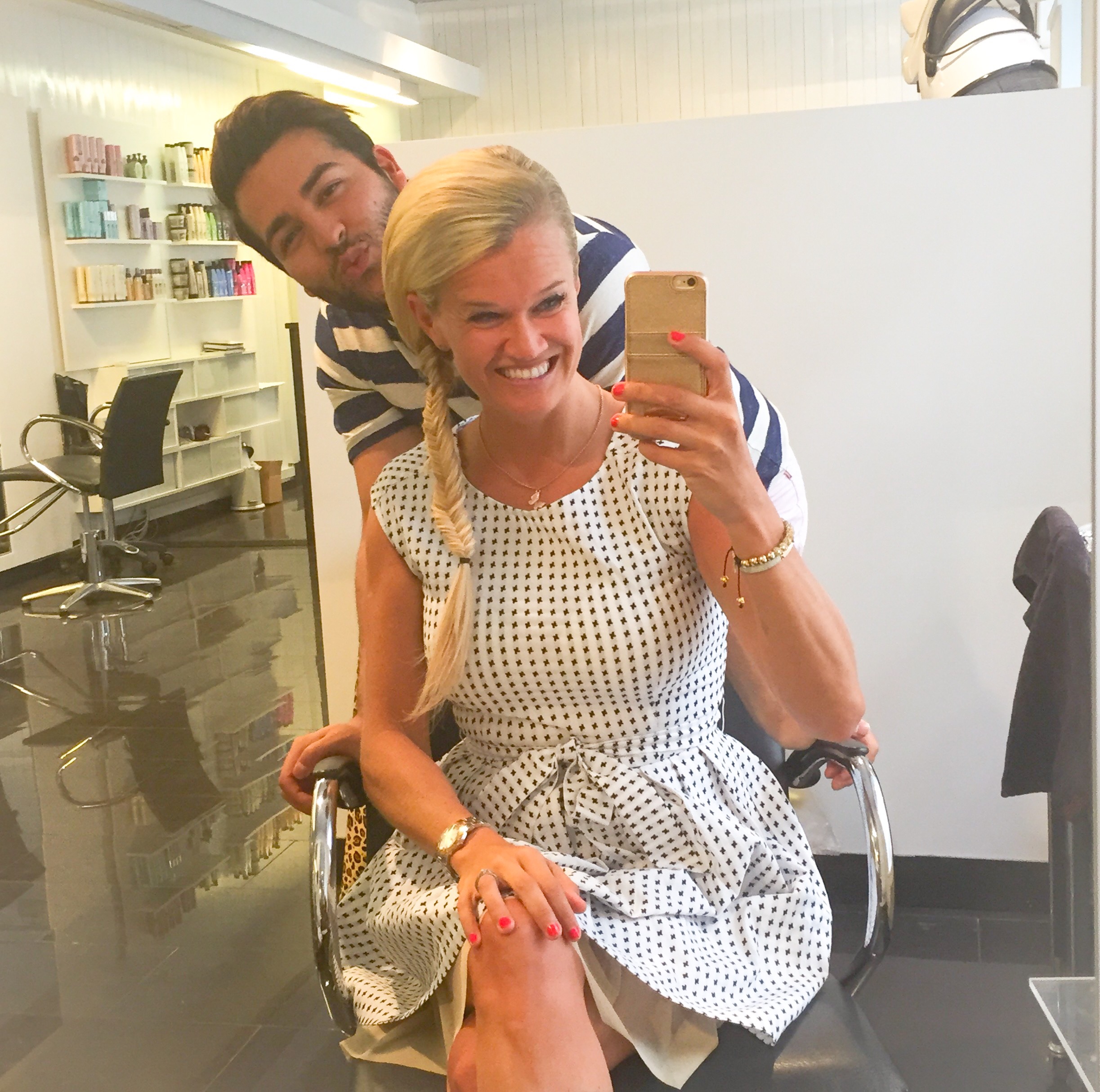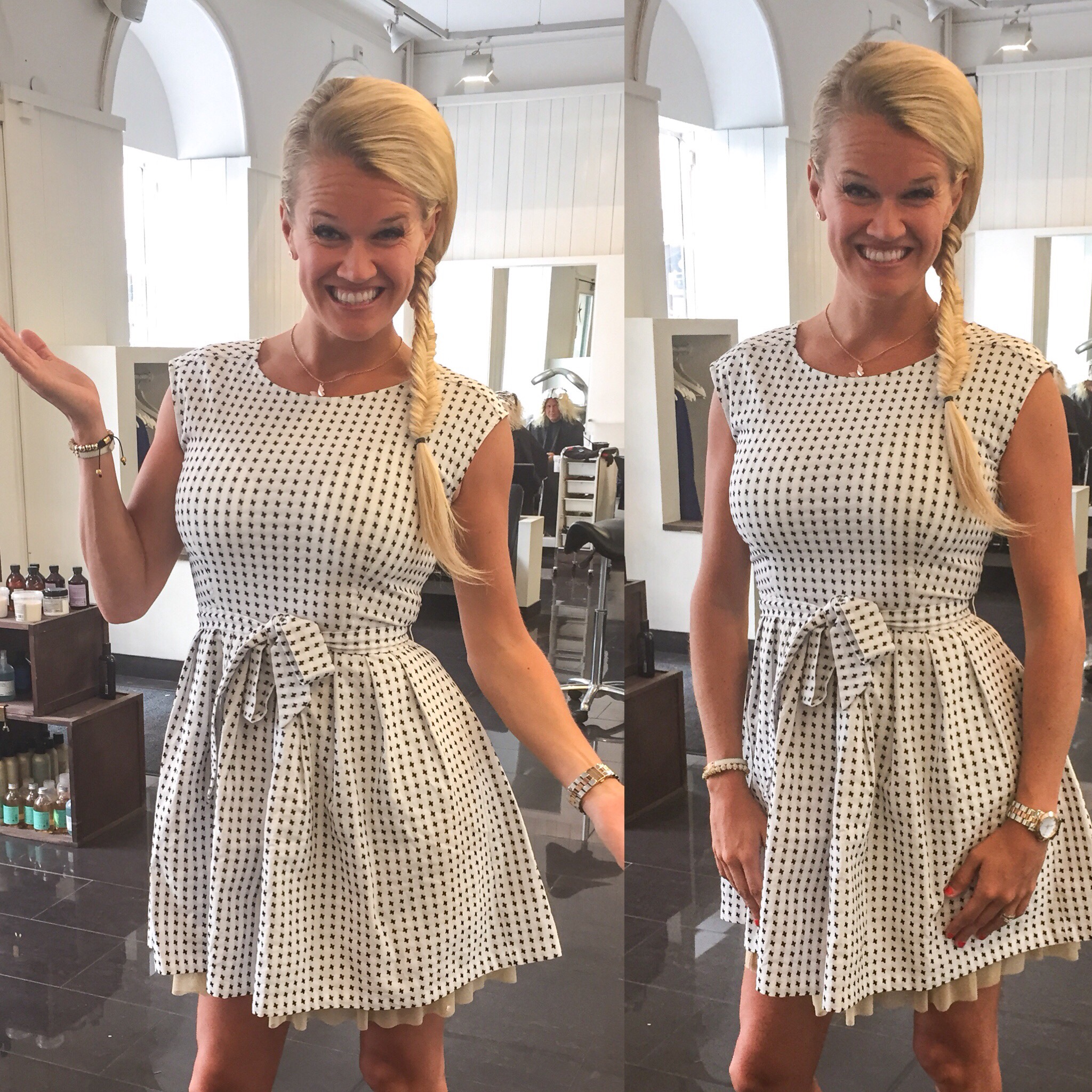 Divo fixade frisyren, efter Christer släppt saxen.:) Det blev en fiskbensfläta tillsammans med min nya klänning från Pernilla Wahlgren Collection, bara älskar hennes klänningar!