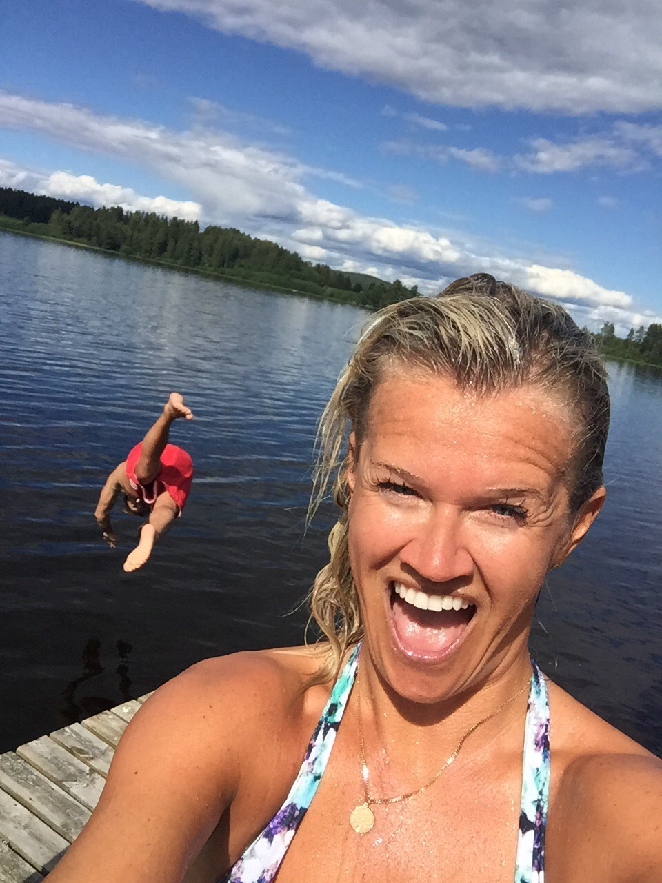 Modigs brygga 1 aug 2015 av Therése Modig Bättra på badstatistiken lite och passar på med fler dopp. Christer missa bryggkanten och snubblade visst.