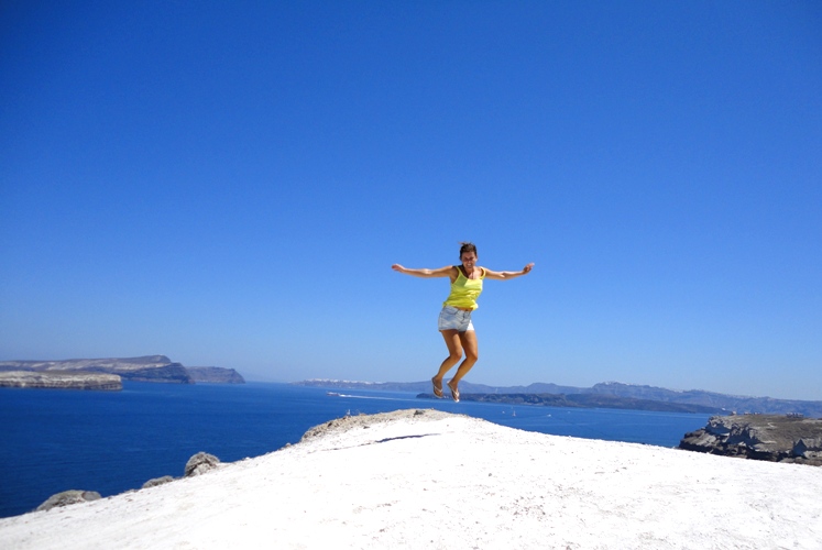 Sen man blev reseledare så är det flygande eller hoppande bilder som gäller. Tror det är så, för att då visar man glädjen som mest för hur man känner för jobbet…om ni frågar mig iallafall. Idag så lyckades min mamma få en rätt okej bild….efter 23 försök hehe:) Skam den som ger sig!!! Här flyger jag vid Faros, Santorinis sydvästra spets.