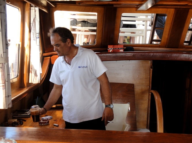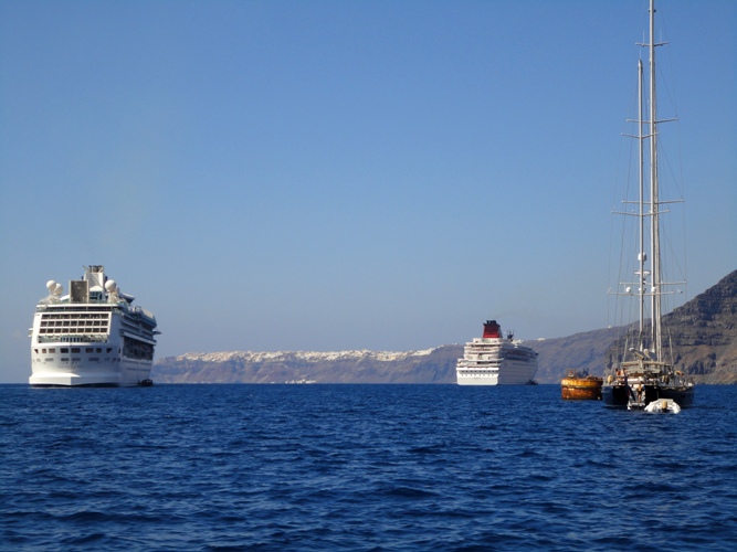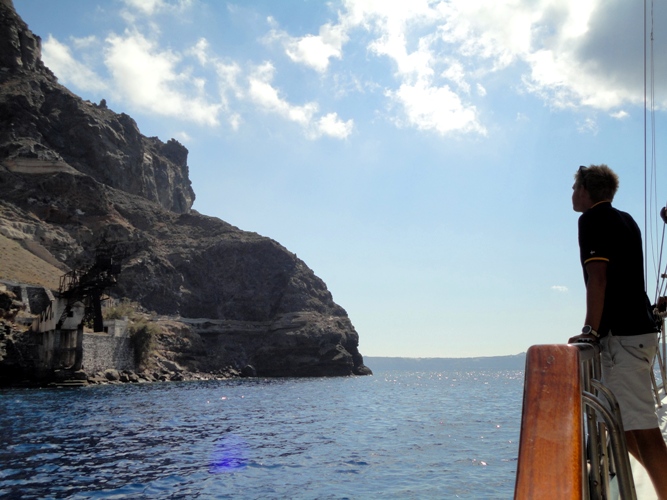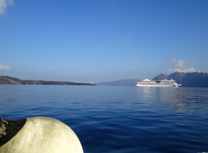 I tisdags så körde jag utflykten caldera cruise. Jag körde den ihop med Kasper som jag arbetade med förra året här. Det var ju ”vår” utflykt, det var riktigt skoj att få köra den igen med honom. Känns som ”old times”:). Sen har varenda tur denna säsongen bjudit på vågor eller en bedrövlig vind. MEN denna gången var havs ytan glasklar! T.o.m kaptenen frågade mig vad som skett med vädret hehe. Passade iaf på att ta en del bilder o detta är några av dem. Fira by, Aspronisi (lilla vita santorini ön), Nikos vår lille båtman;),en katt på restaurangen (första katten jag kelat med sen jag blev guide), Kasper som står o njuter av pimpstens väggen o de gamla mingruvorna och en blandning av lyxkryssare mm. Underbar plats att befinna sig på!