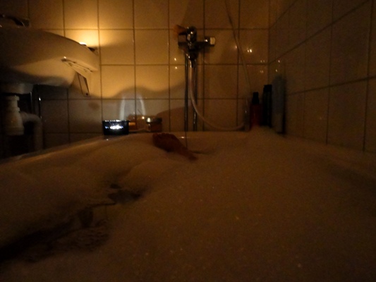 Tankar, rastlöshet, värme, önskan. Det är lite av vad som sker under en stund i badkaret, ensammen med ljuvlig stilla musik. Men gud så avstressande. Bada badkar är något som folk underskattar tro jag. Detta skulle man unna sig en gång i veckan. Tänk er efter en stressad arbetsvecka, komma hem, vrida på kranen med fullt ös varmvatten och sedan tända ljus, sätta på mysig musik (eller varför inte lite ”galen” musik, vad än som får en att slappna av) o sen bara hoppa i o låta all stress glida ur en. Raka benen (om du är tjej…?) o därefter en svalkande dusch med världens godaste peeling gel från h&m. Som ny….efter ett glas vatten för man blir ju nästan svimfärdig i värmen i badrummet….o redo för kanske en sväng på stan med tjejerna…