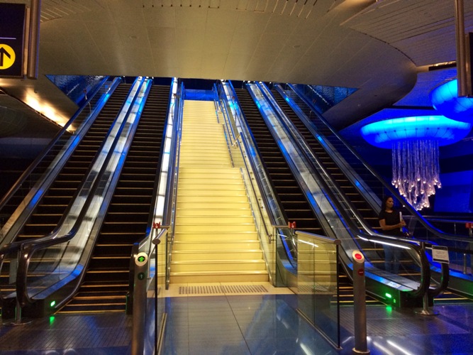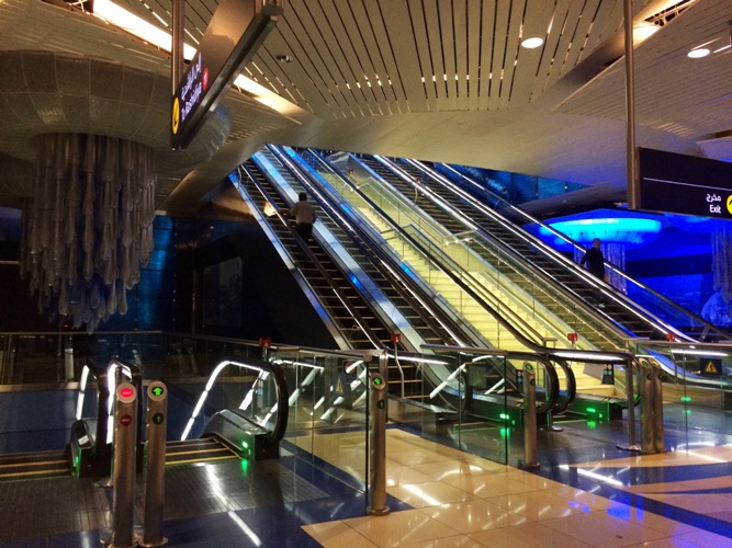 Det finns 2 metro linjer i Dubai, den röda som följer längs med Sheikh Zayed road ut mot flygplatsen – öppnades 2009-09-09. Sedan är det den gröna linjen som går inom Bur Dubai och Deira – de äldsta stadsdelarna där allt började i Dubai – som öppnades 2011-09-09. Här går metron större delen under marken som tunnelbanorna i Stockholm. Det är otroligt lätt att åka metro i Dubai. Eftersom det bara är 2 linjer så behöver du bara hålla koll på vart du ska av (självklart) samt i vilken rikting du ska. Man kan köpa olika slags åk-kort som också gäller på bussar. Silver kortet är det vanligaste. Kostar 20 dhs, själva kortet 6 dhs och du kan åka för 14 dhs. När den summan tar slut är det bara att fylla på med hur mycket man vill. Man stämplar in och sedan stämplar ut. En hel resa genom Dubai kostar ca 4,5-6 dhs, med taxi kan det kosta upp mot 60-80 dhs. (dhs=dirham, multiplicera med 2 så får man ut den ca svenska summan)