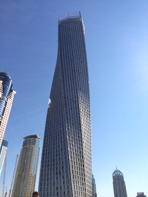 Cayan Tower blev klart förra året och har idag lägenheter. Den minsta studion, om man bara ska hyra, kostar för ett år ca 20 000 SEK/månad. Cayan Tower är 307 m högt och är världens mest vridna byggnad med sina 90 grader. Många brukar jämnföra byggnaden med Turning Torso, men som ”bara” når upp till 190 m. Cayan Tower är personligen en av mina favorit byggnader i Dubai. Jag anser det vara en kvinna med sina kurvor;)