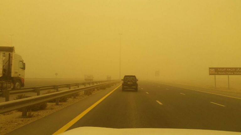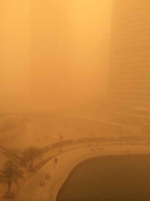 Jo men i torsdags så drabbades UAE av en av de värre sandstormarna på flera år. Den sandstormen jag är van vid är när allt bara yr kring pga av hårda ”vanliga” vindar ochman känner sandkornen pina emot din bara hud som små nål stick.
