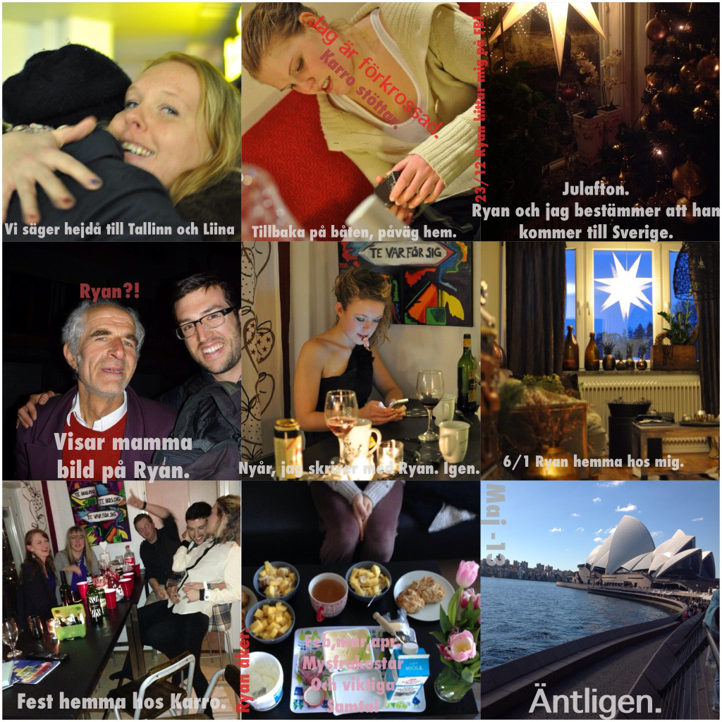 Jag berättade för mamma om hur jag kom att träffa Ryan och hur han nu skulle komma och hälsa på mig. Mammas ögon tindrade. Hon ville se en bild på Ryan. Jag, som ibland kan vara lite busig fick en briljant idé. ”Han är lite äldre än mig” sa jag. Vilket är hundra procent sant. Ryan är två månader äldre än mig, men bilden jag visade mamma visade något annorlunda. Jag tog en bild från Ryans Facebook där han står bredvid en mycket gammal gråhårig man. Jag zoomade in den äldre mannen och visade mamma bilden. Mammas ögon som tidigare tindrat fylldes nu med tårar. ”Näeä Lilian” sa min stackars mamma och jag riktigt såg hur missnöjd hon var. Jag skrattade, zoomade ut och där var Ryan. Mamma log och jag tyckte mig se tinder i hennes ögon igen.6/1 och jag hämtade Ryan på flygplatsen. Vi spenderade en vecka tillsammans innan han reste vidare mot London för att sedan åka vidare mot Vietnam där han kom att spendera en månad innan han skulle tillbaka till Australien. Under dagarna tillsammans blev vi kära. Inget skulle bli som förr efter det. Speciellt inte för mig.