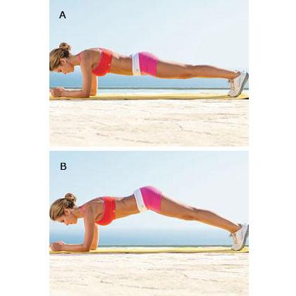Ställ dig som position A visar. Som en planka. Position på underarmar, armbågar i enlighet med axlarna, händerna och handflatorna mot varandra, dra upp dina magmuskler och håll – ju flera sekunder desto vackrare och starkare blir du [A]. Lyft höfterna rakt upp. Håll i 2 punkter, sedan tillbaka till utgångsläget och upprepa [B].