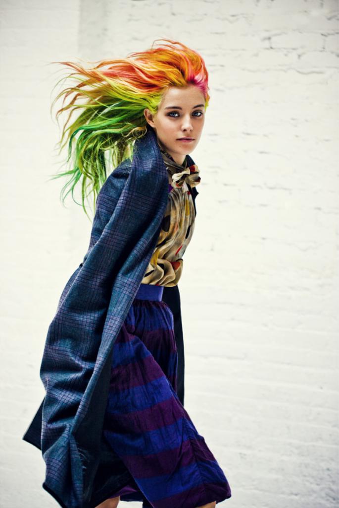 Trend 2014. Start right now like colourful model Chloe Norgaard. Have you girls been wondering about that green-haired model that’s been catching your eye during New York Fashion Week? She’s been in Nicole Miller’s last two shows, and she rocky rocky everything from purple to flame to rainbow coloured hair during her year and a half on the modeling scene.