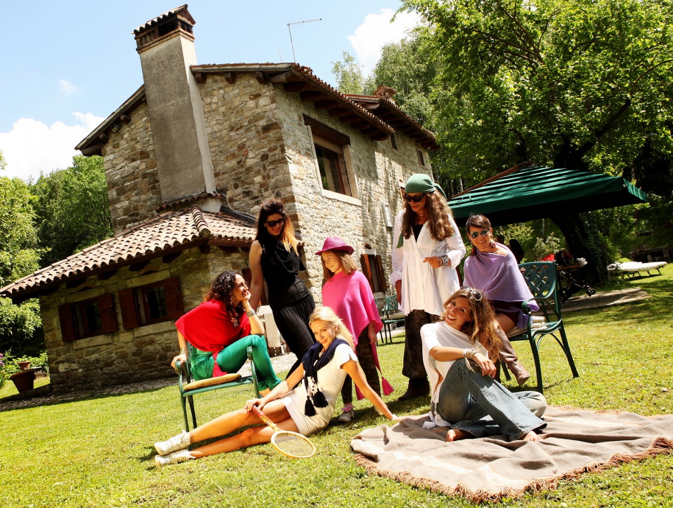 Kusinen MG till höger med hennes vänner och vackra mor, Leonardos zia. Jag sitter med svärfar Giorgios gamle racket från 60-talet. Ett utav deras underbara hus här i närheten, mera idylliskt än någonsin. Photo shooting för hennes poncho´s.