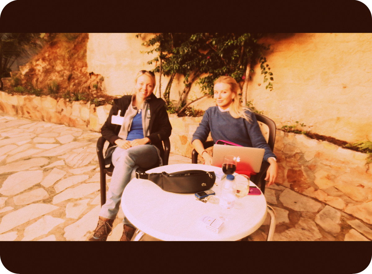 Jag och min kollega Anna vid arbetsbordet utanför vår härliga bostad 🙂
