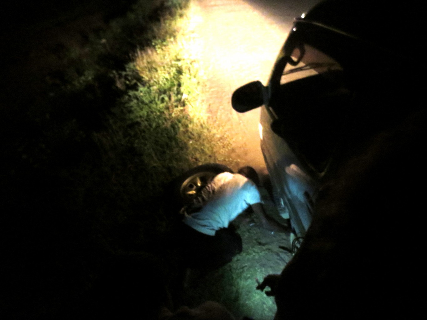 Så initiativ från Vero…sedan initiativ nr 2 hjälpa till med ljus från Iphone mot byte av bildäck. Jag började undra hur den mörke hade tänkt få ut trött däck mot friskt däck(???), då inget litet lyftkrans-verktyg syntes till i buschen. Ett tag sågs vi 4 putta roligt och starkt bussve så den mörke skulle kunna komma åt att få loss däckve – funktion ej den mest pålitiga 🙂