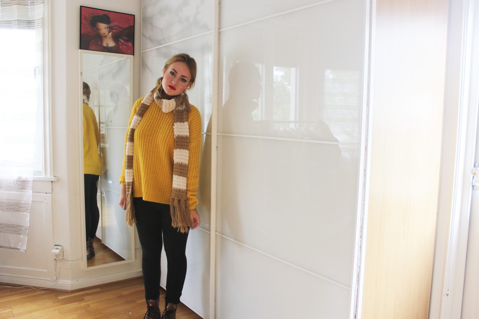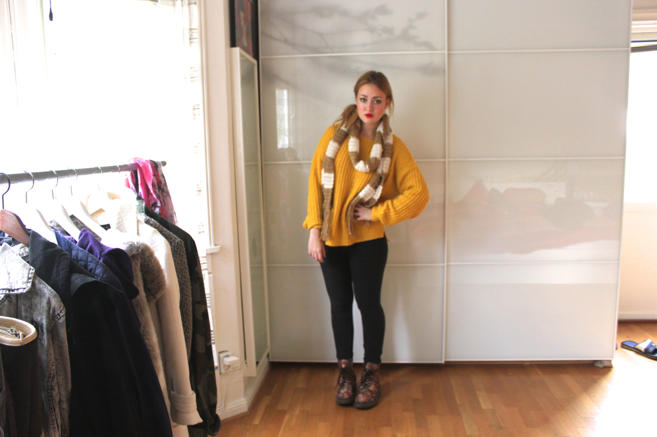 Detta är absolut hösten i en outfit för mig. Den senapsgula stickade tröjan representerar löven och halsduken lika så! De mjuka tightsen gör bara outfiten ännu mysigare och ger den mer definition med den mörka färgen. De röda läpparna är bara pricken över i:et. Med detta sagt säger jag godmorgon!