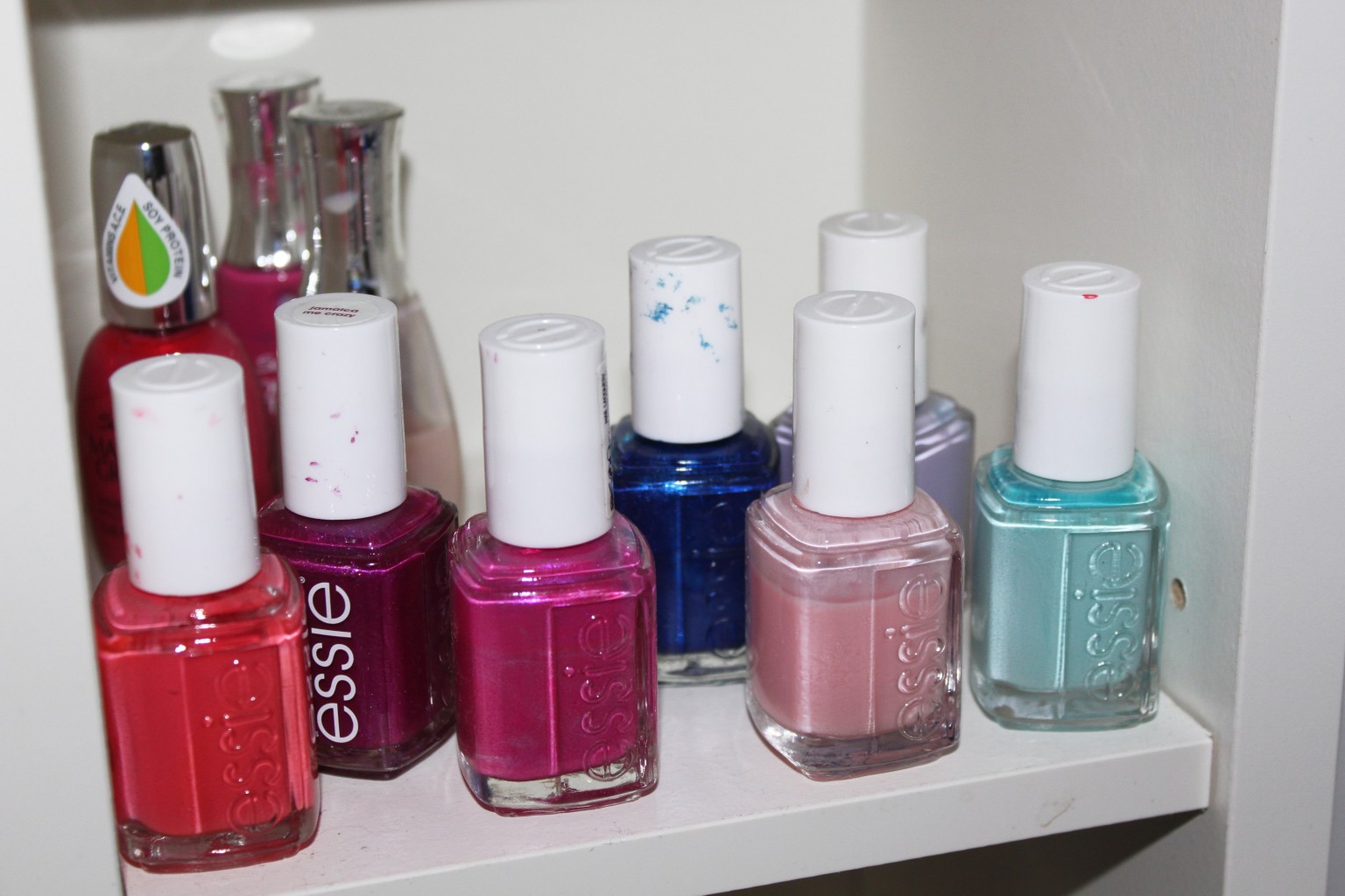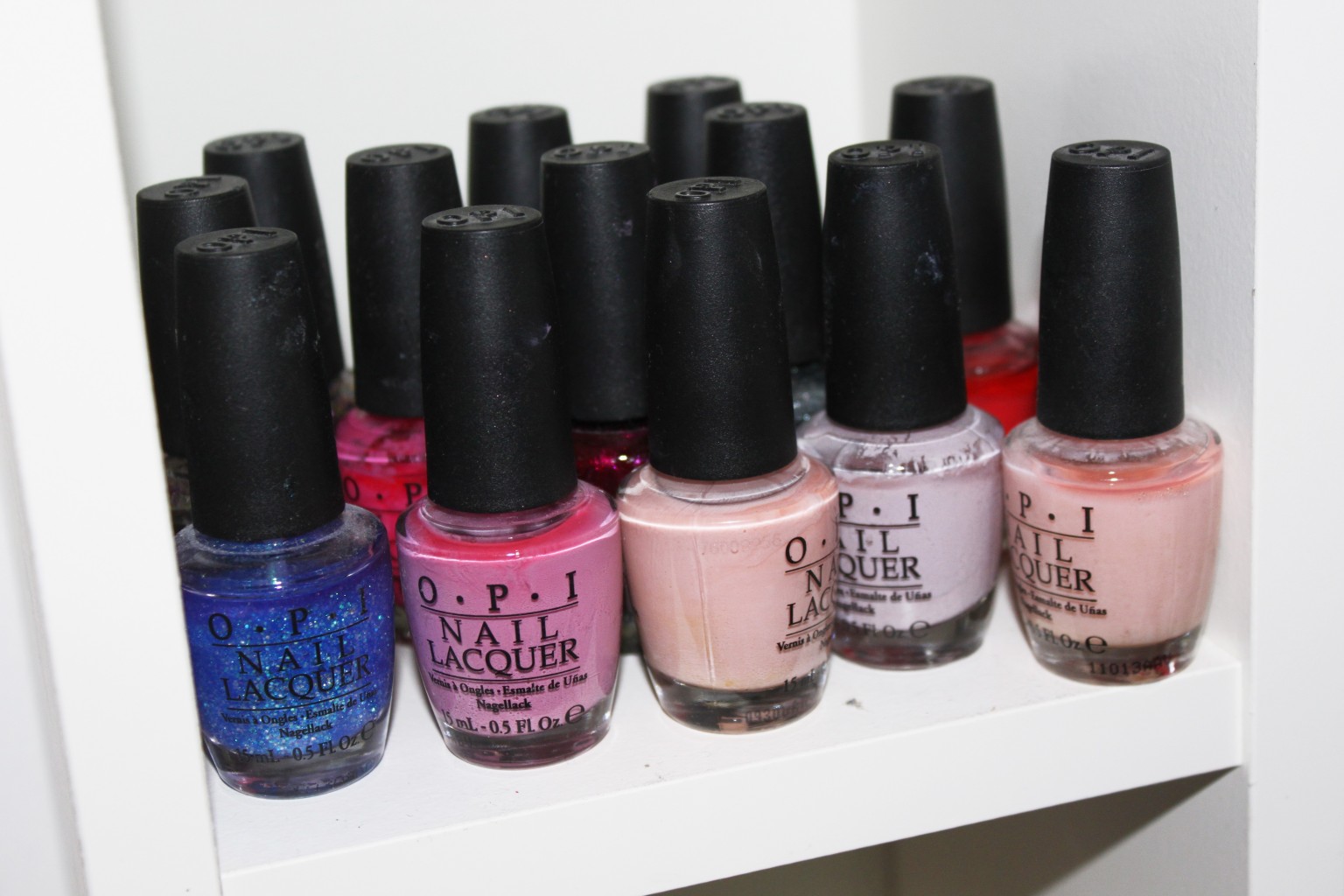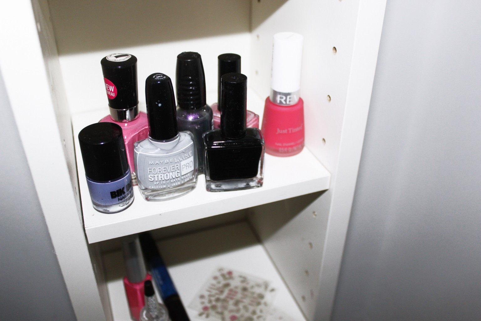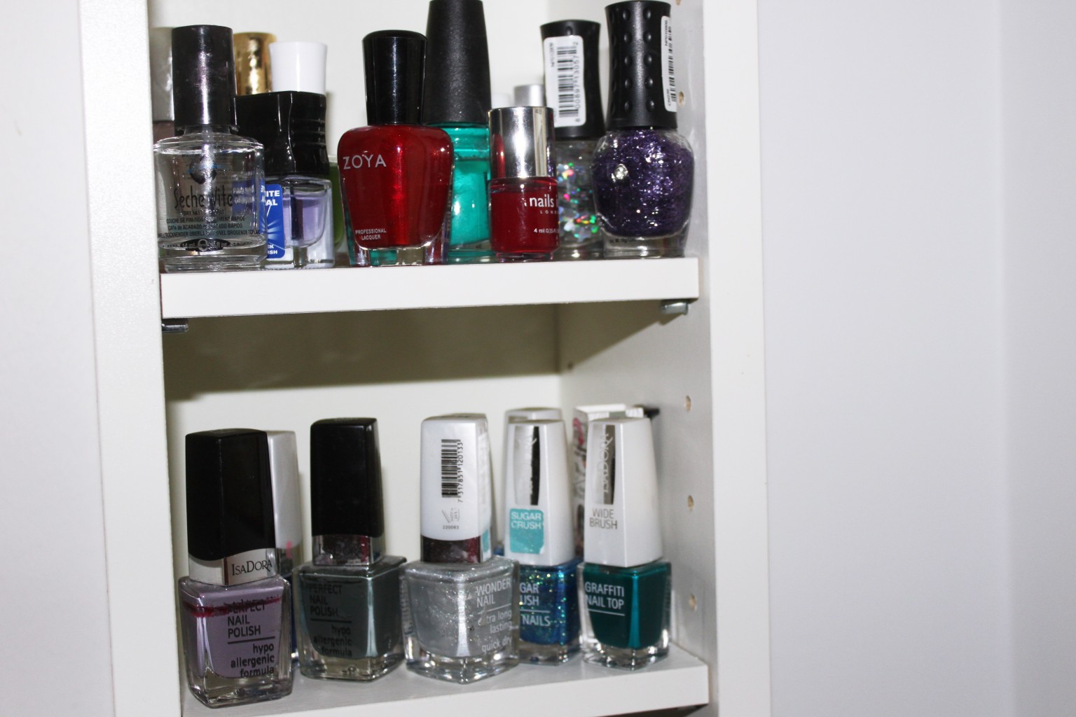 Jag fyllde hyllan med bland annat min nagellackskollektion. Sorterade dels via märke, som ni ser har jag en hylla med OPI, en med Essie och så vidare. Av visa märken har jag dock inte så många lack, därför blev det även lite blandade hyllor!